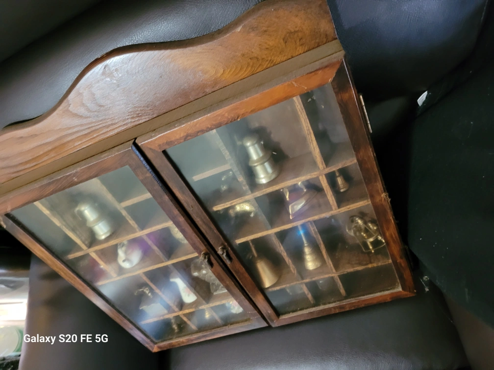 Glass case only..Mini statues sold separately.Here's a charming wooden display cabinet, perfect for showcasing your collection of small trinkets or miniatures! It has a warm, rustic feel that would look great in any room