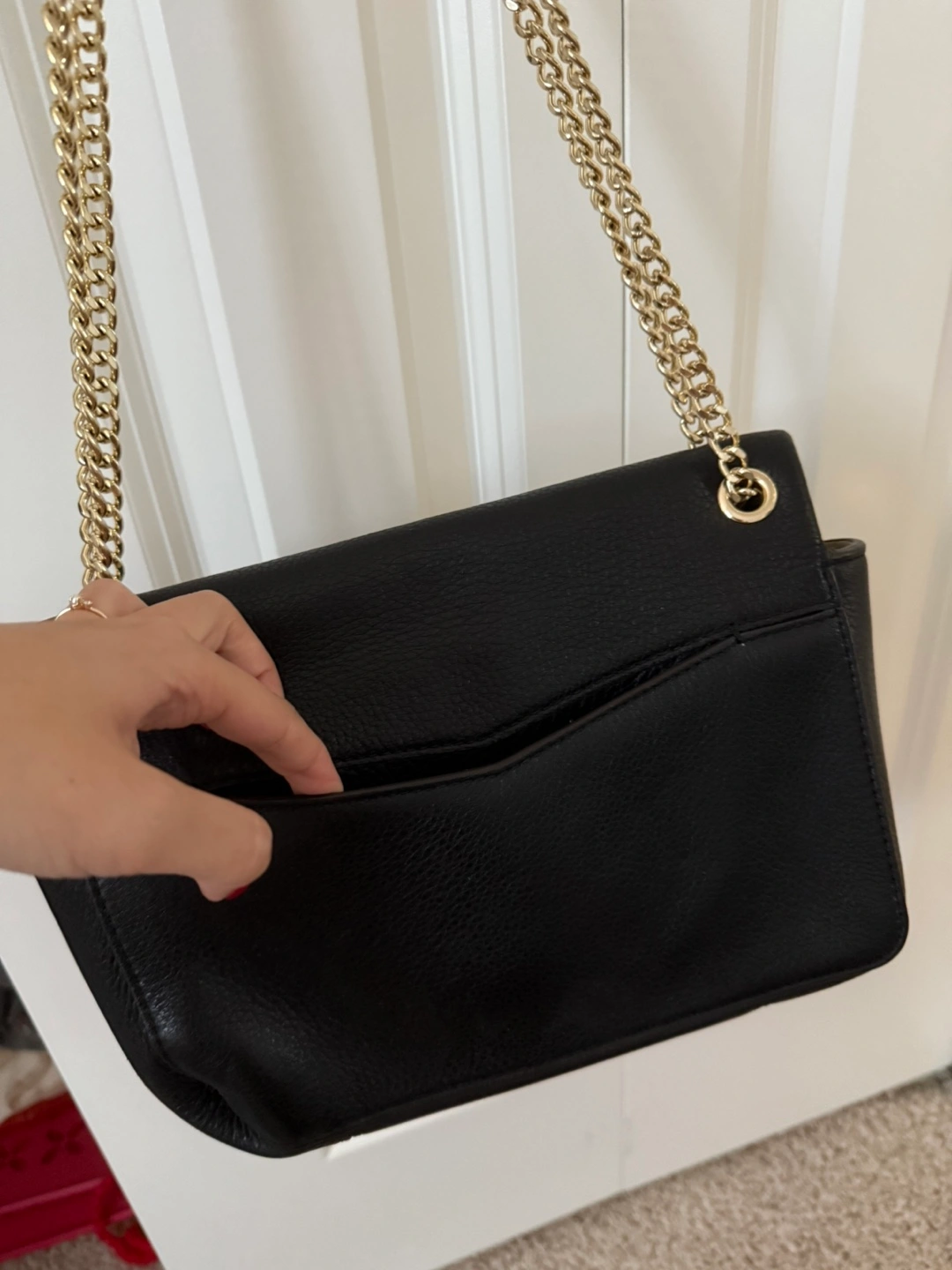 Selling a Sandro black leather shoulder bag. It has a gold chain strap and gold hardware. The interior is lined with a beige suede-like material and outside is genuine leather. It's in great condition! It has two pocket compartments and changes into a crossbody.