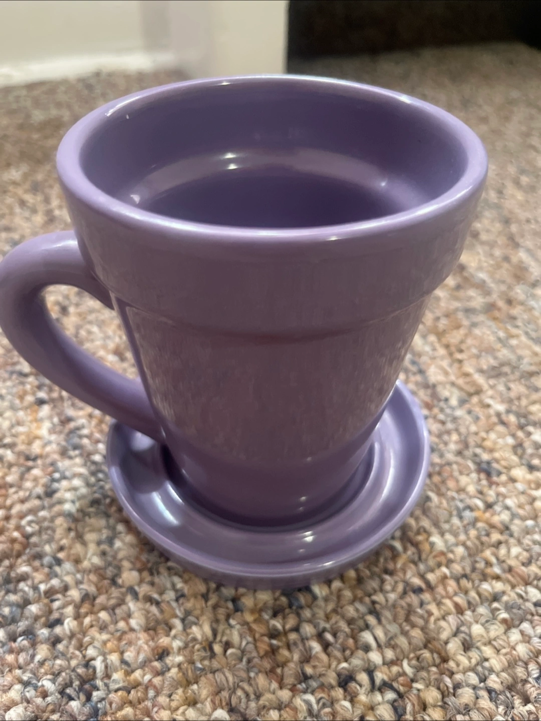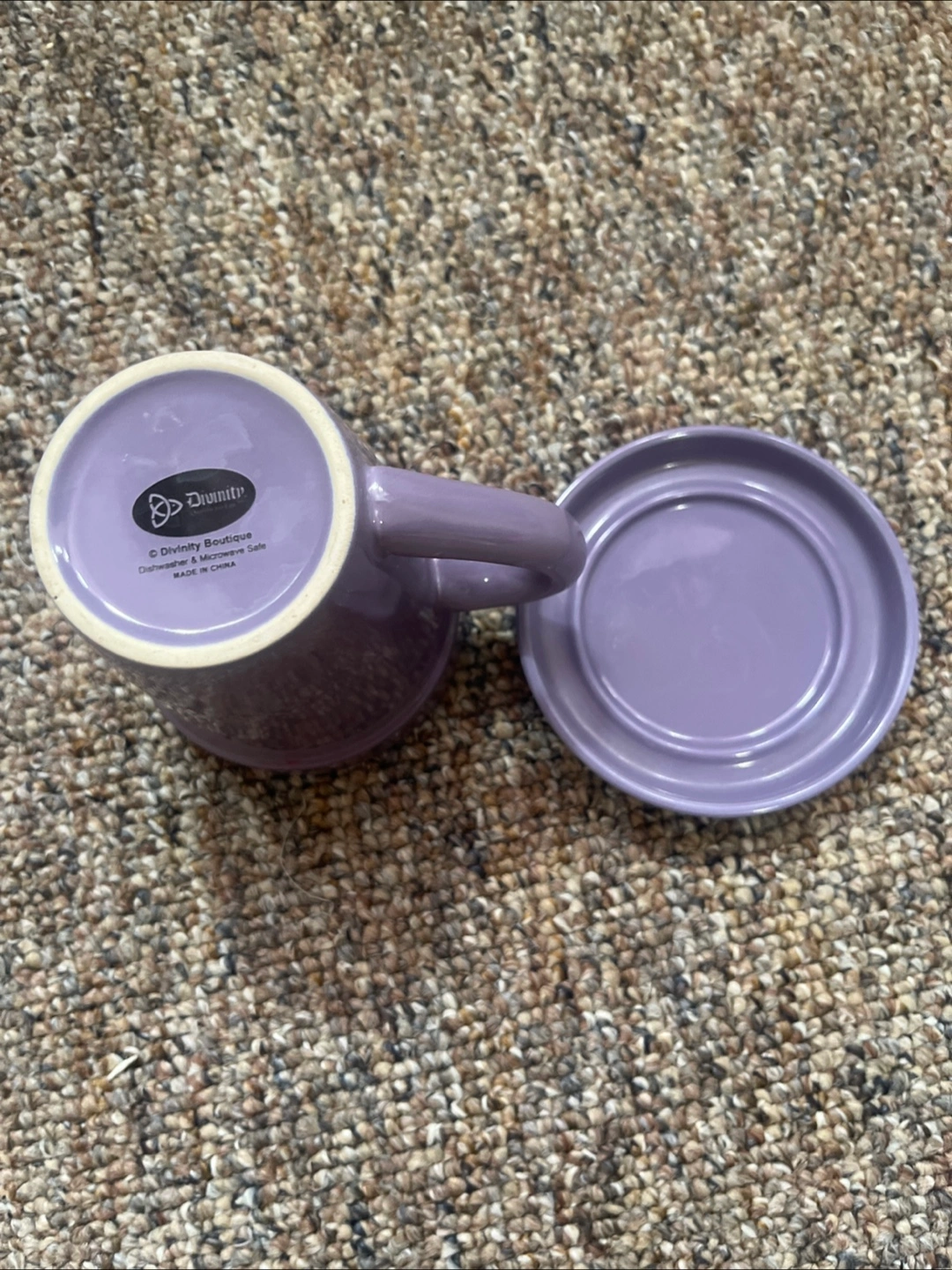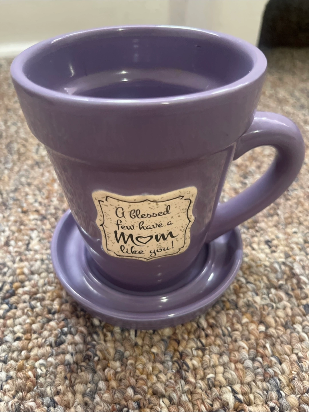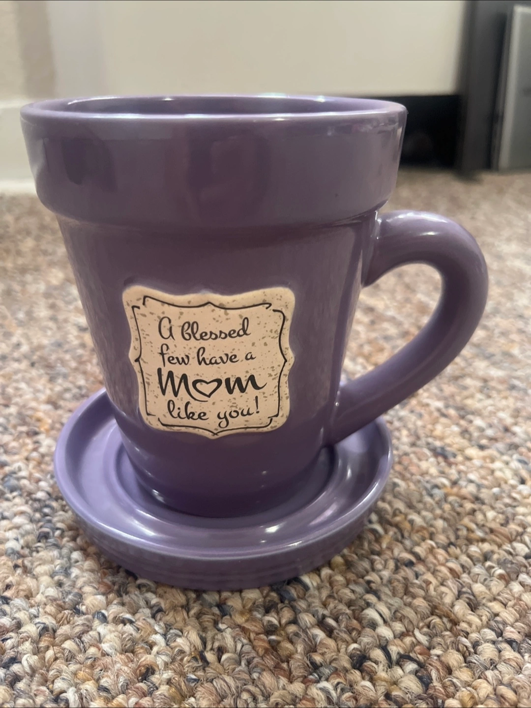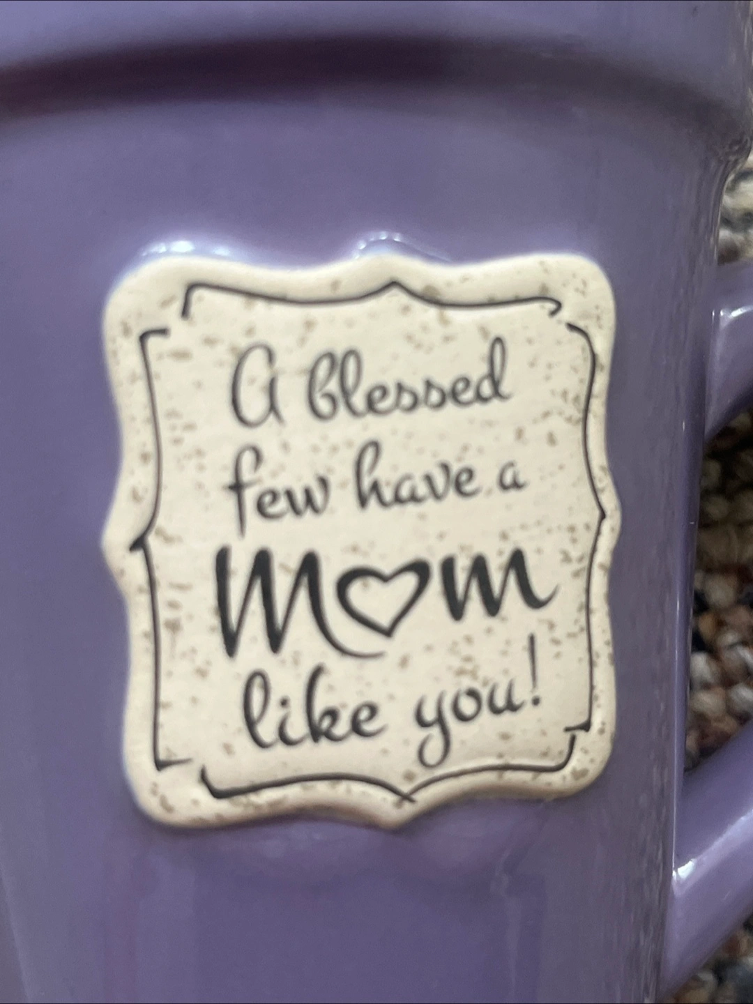 Selling a cute lavender mug from Divinity Boutique! It comes with a matching saucer. The mug has a sweet message that says, 'A blessed few have a Mom like you!' It's dishwasher and microwave safe, so super convenient for everyday use