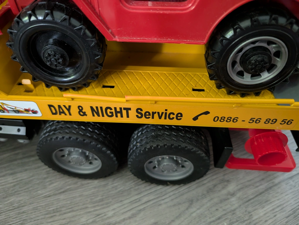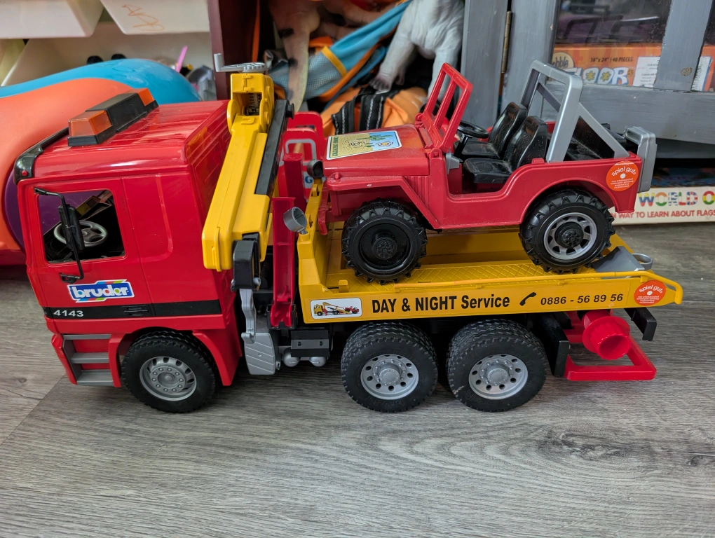 Selling a Bruder tow truck with a Jeep. It's a great toy for kids who love vehicles! it does have a crack in the railing as shown so is priced to reflect that.