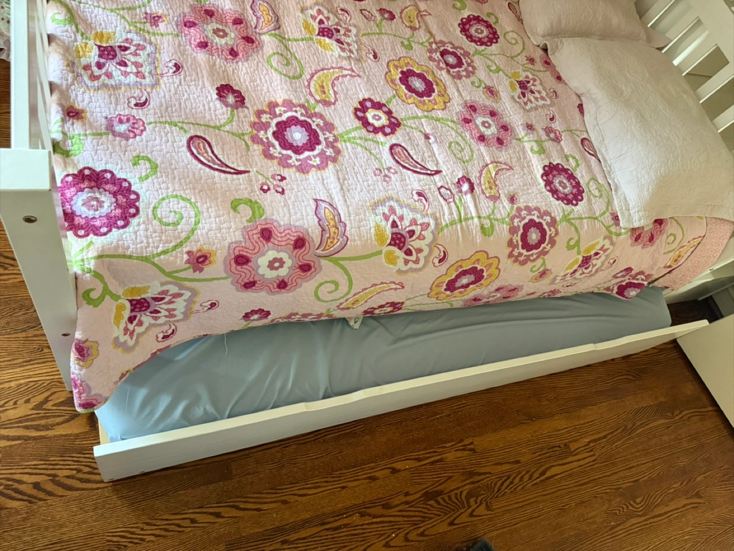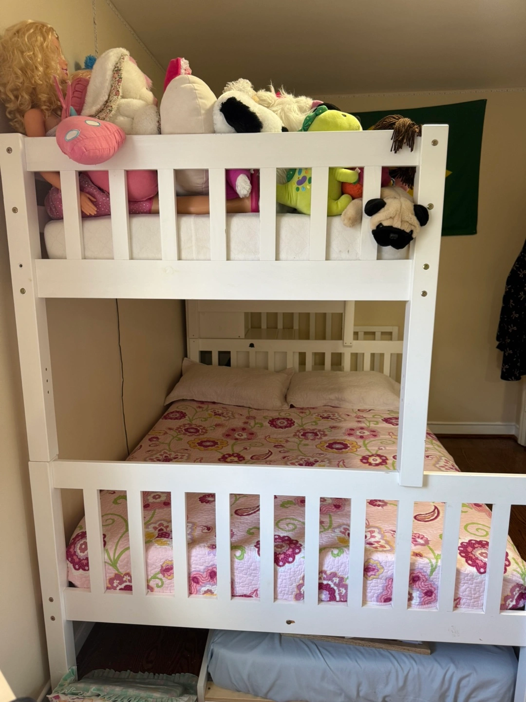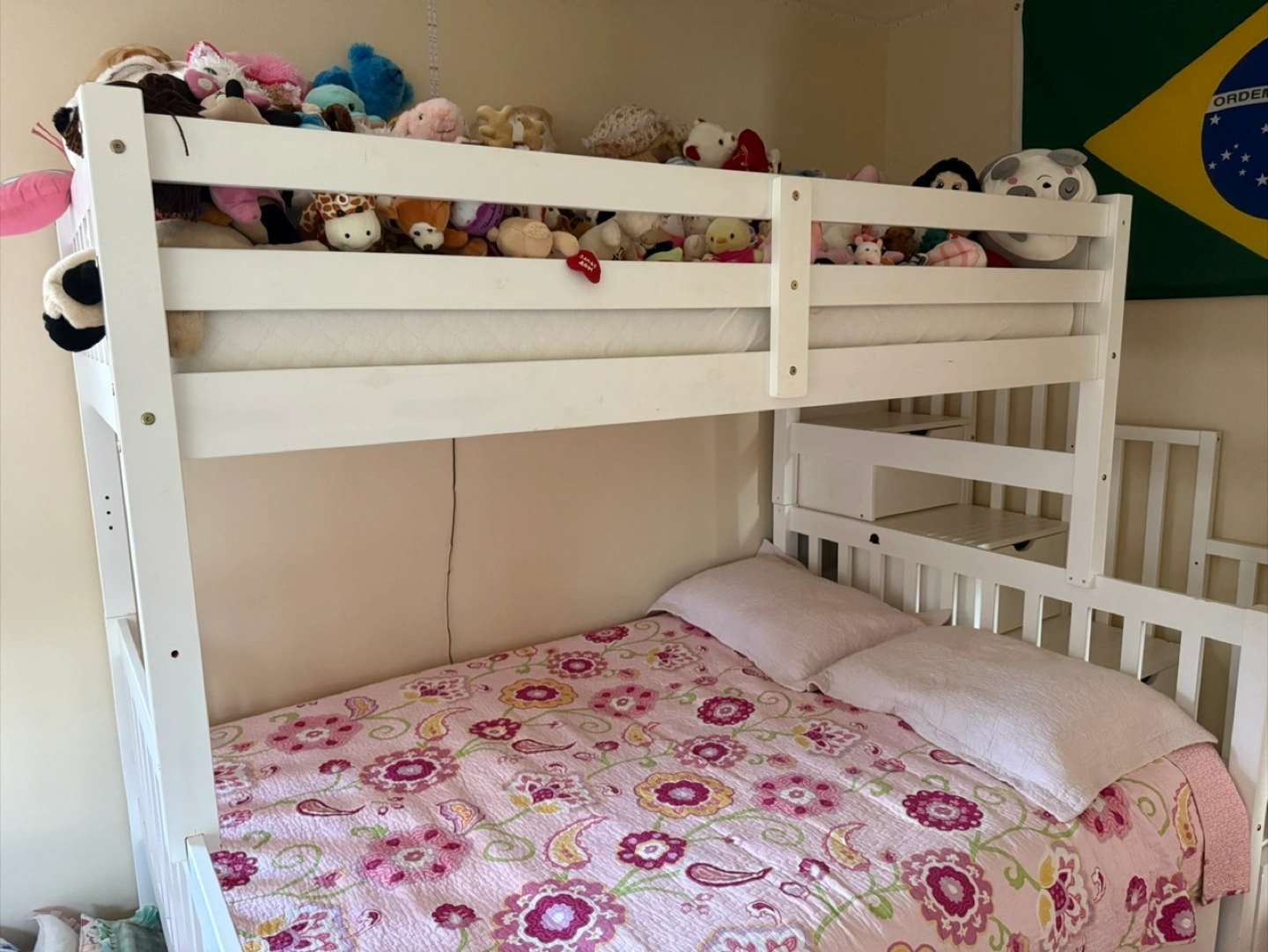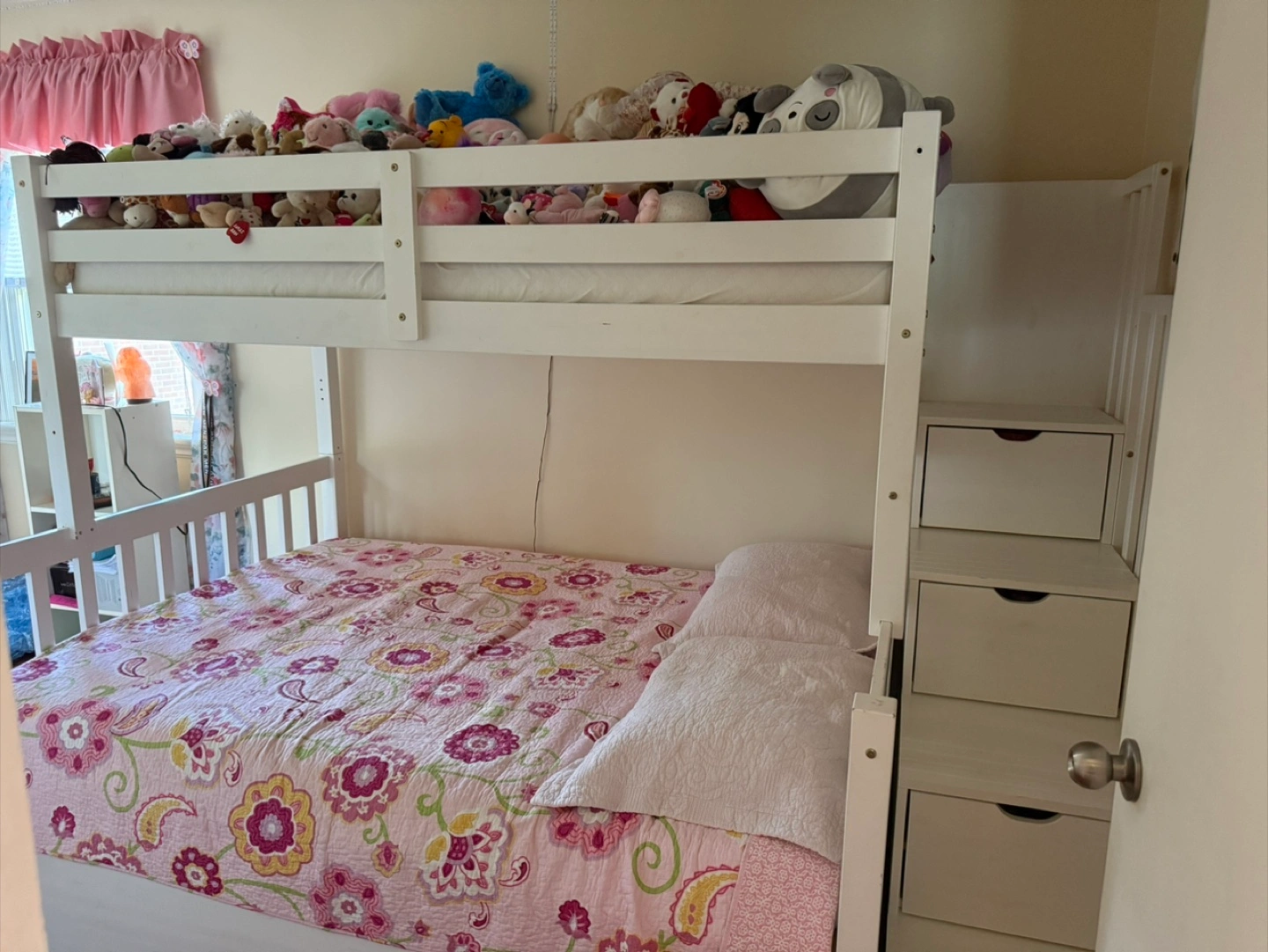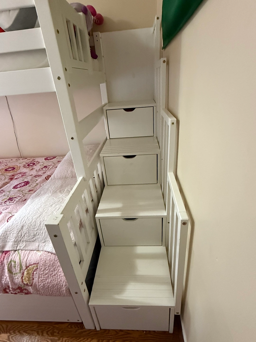 White wooden bunk bed. It has a built-in staircase with drawers for storage. The bottom bunk is a double bed, and the top bunk is a twin. Also has a pull out bed underneath. Great for kids or a guest room. Includes the 3 mattresses but not the mattress cover.
