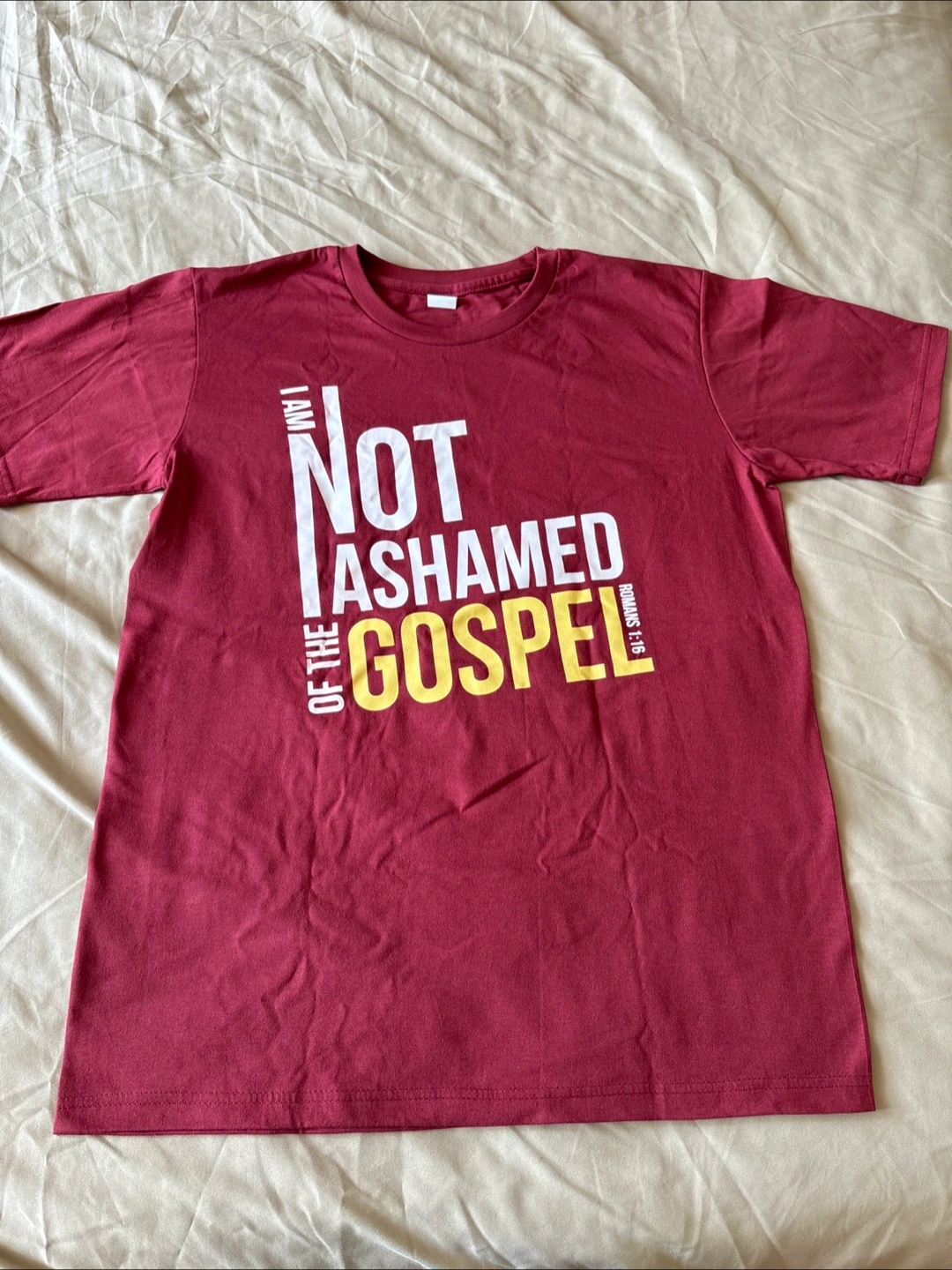 I'm selling a Winner Original t-shirt in size L. The shirt is a maroon colour and features a design with the text "I AM NOT ASHAMED OF THE GOSPEL".