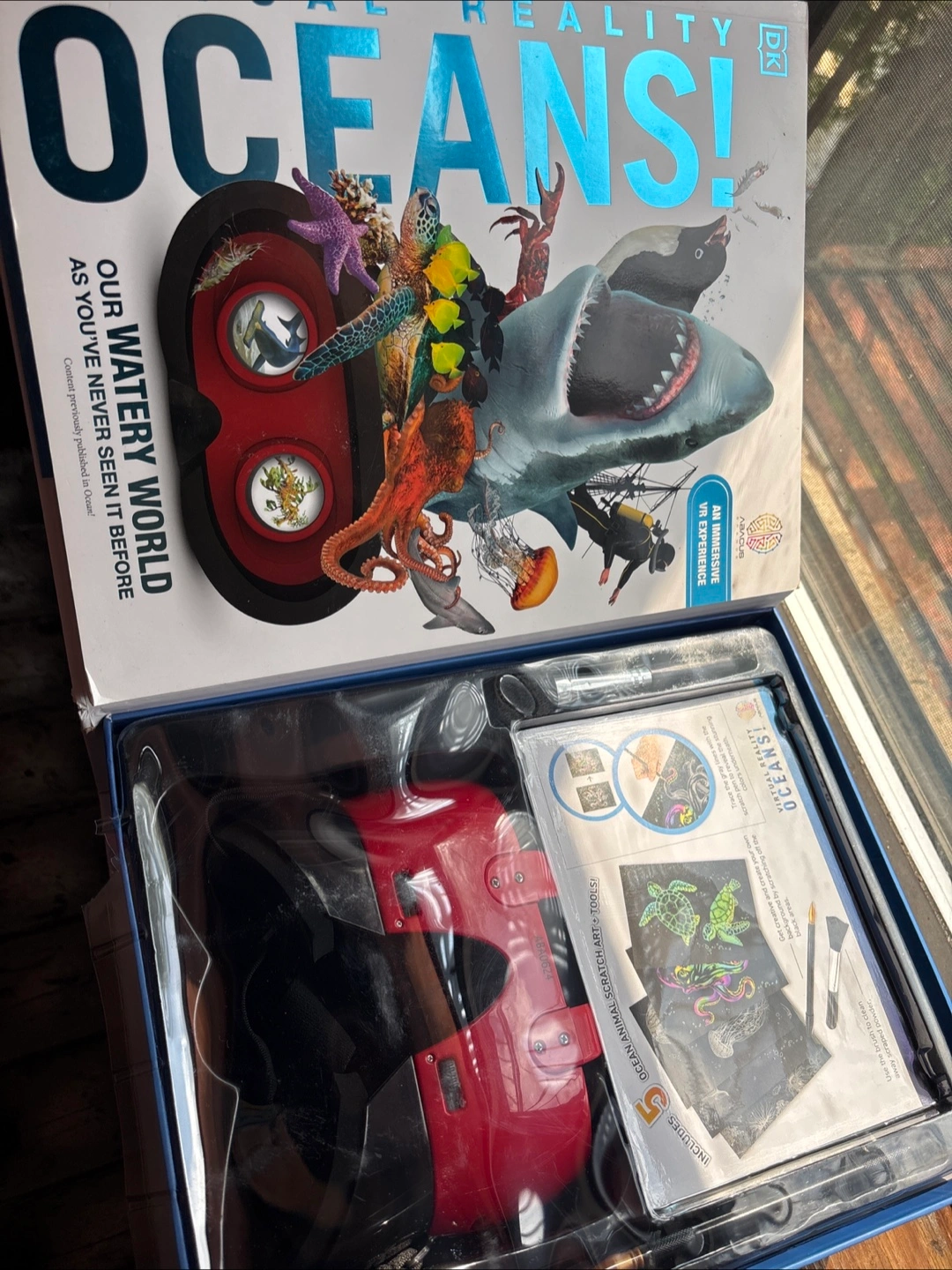 Selling the Virtual Reality Oceans! DK book. It's a 96-page interactive book that includes animal scratch art. It also comes with the VR headset for an immersive experience in our watery world!