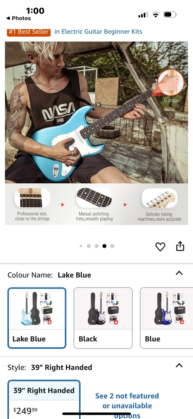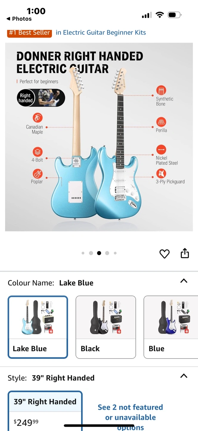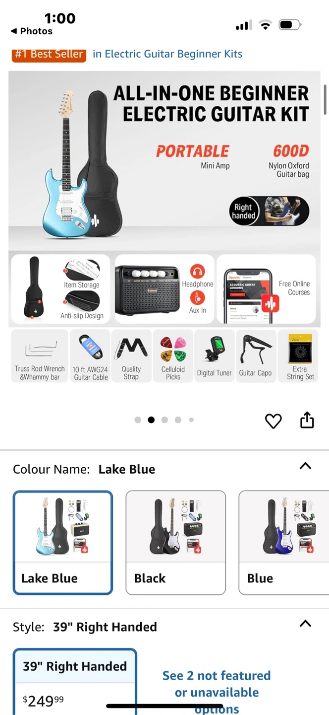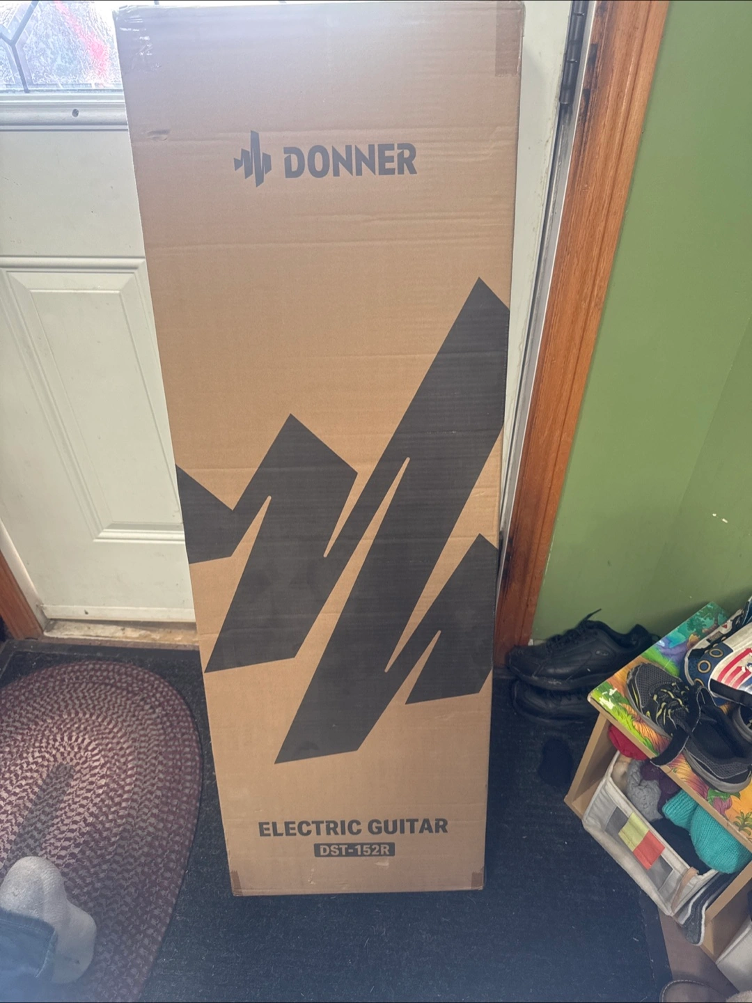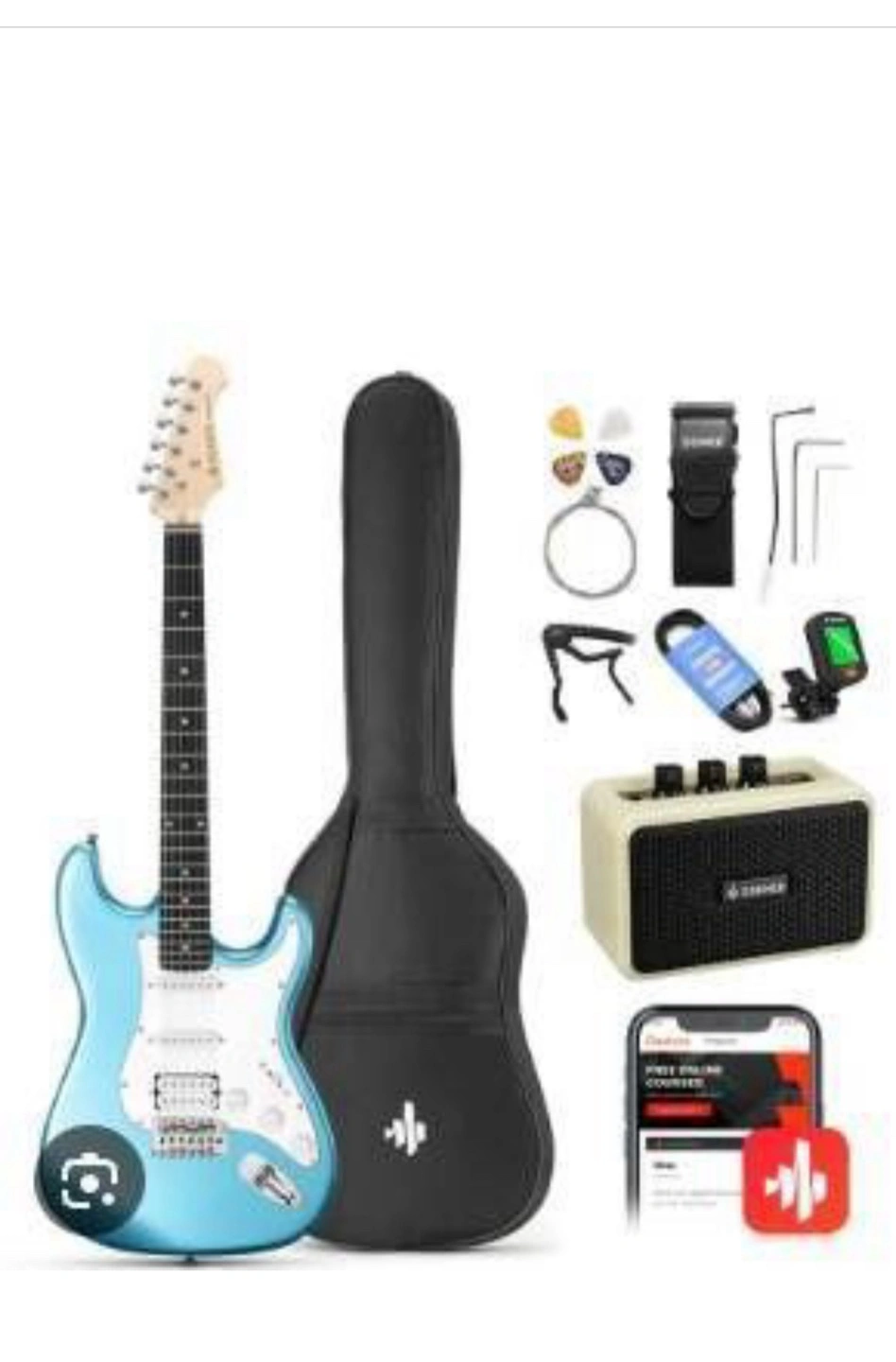 Looking to start playing the electric guitar? This Donner beginner kit is perfect! It's a 39-inch right-handed guitar in a beautiful Lake Blue colour. This all-in-one kit includes everything you need to get started, including a portable mini amp, headphones, a guitar bag, and more! Originally bought for $249.99.