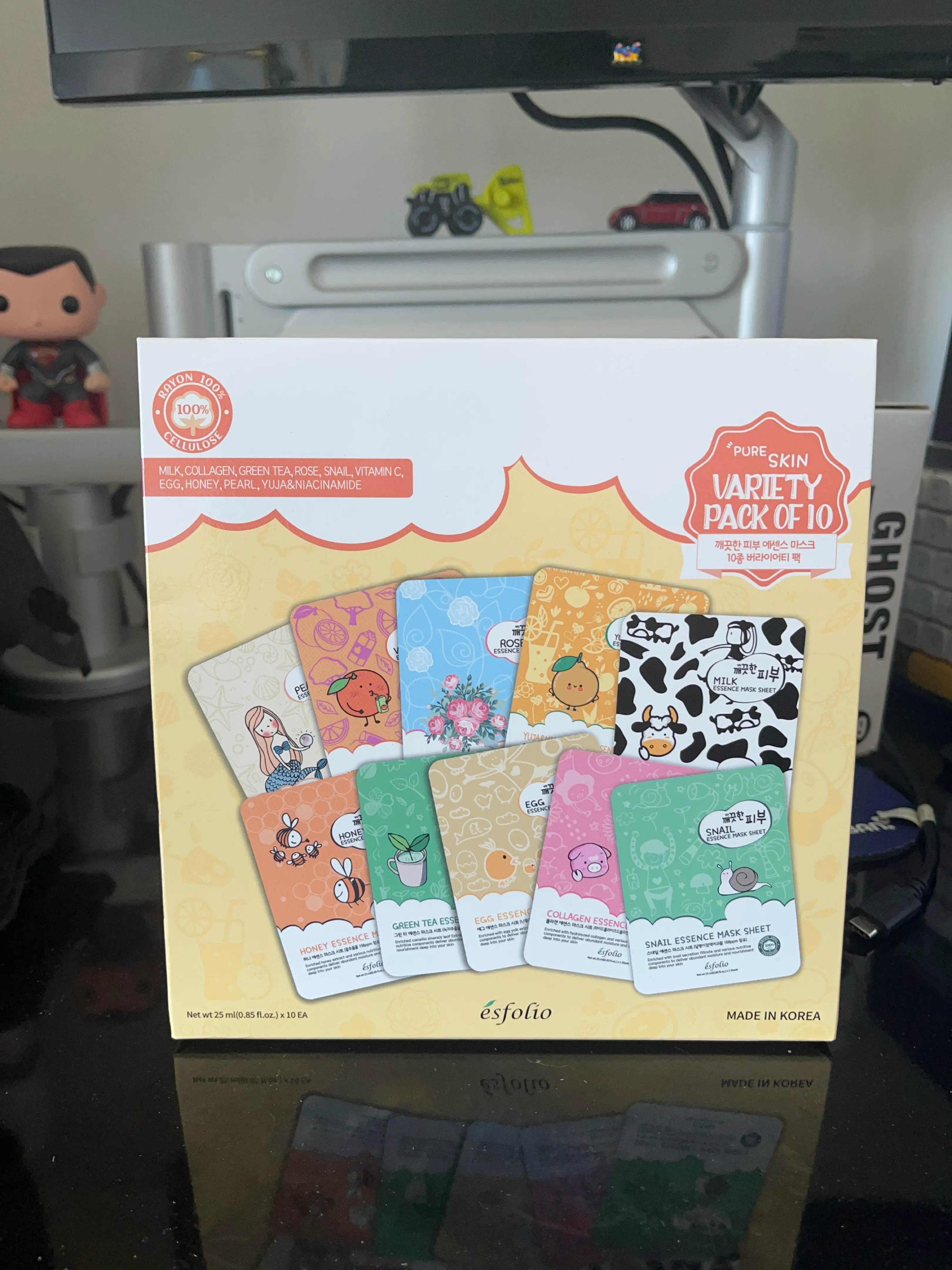 Here's a box of Esfolio Pure Skin Variety Pack of 10 mask sheets! It includes a variety of essences like milk, collagen, green tea, rose, snail, vitamin C, egg, honey, pearl, yuja, and niacinamide. These sheet masks are made in Korea and contain 25 ml (0.85 fl.oz.) of essence each
