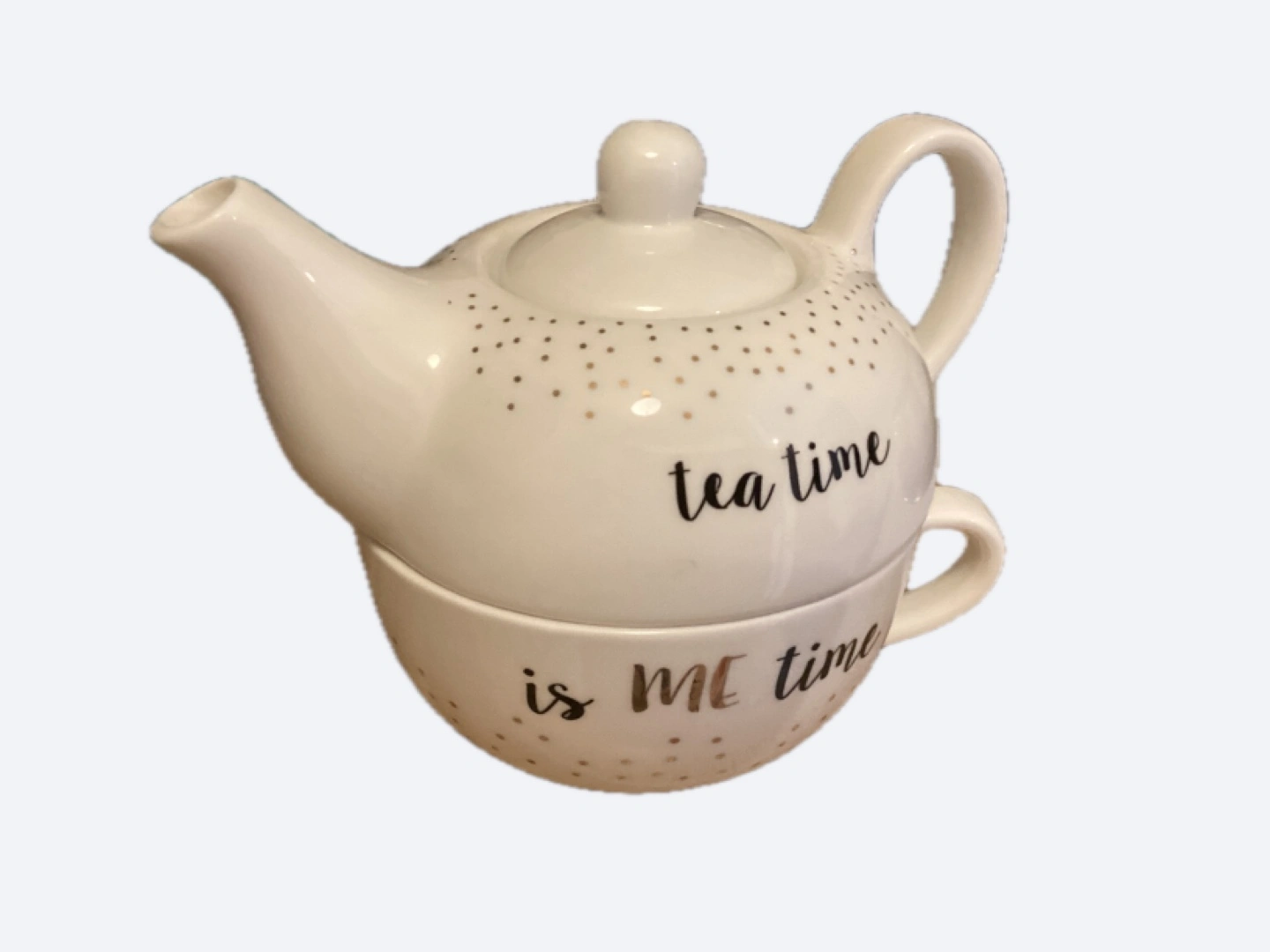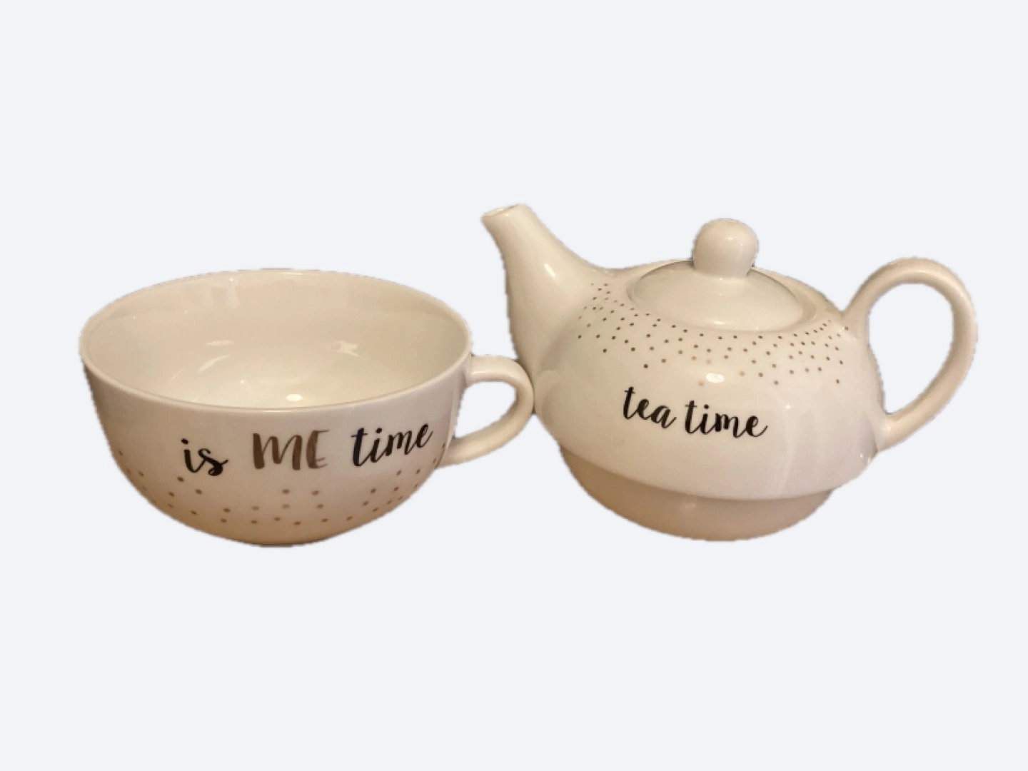 This adorable teapot and cup set is perfect for a cozy tea time! The teapot sits right on top of the cup, making it a space-saving and charming addition to your kitchen or dining area. The set is white with gold polka dots and features the words "tea time" on the teapot and "is ME time" on the cup