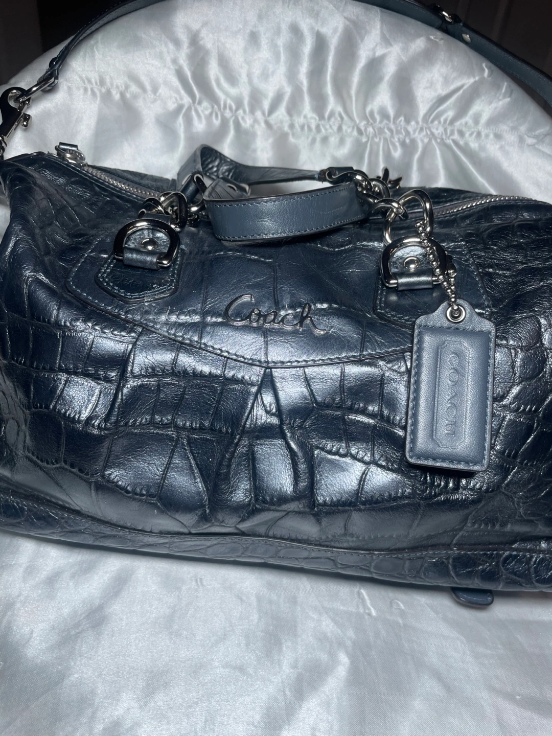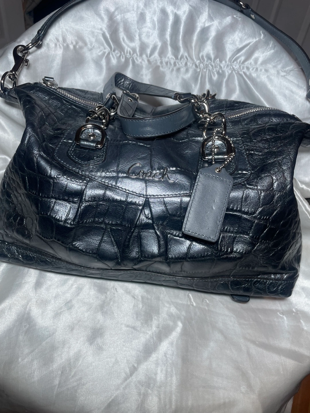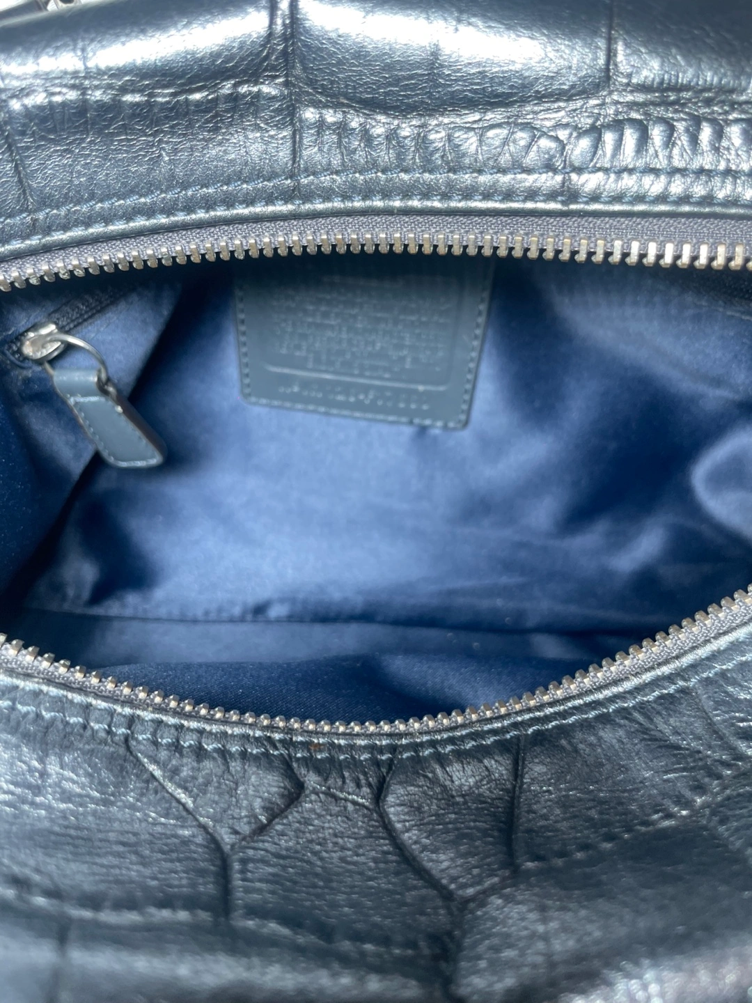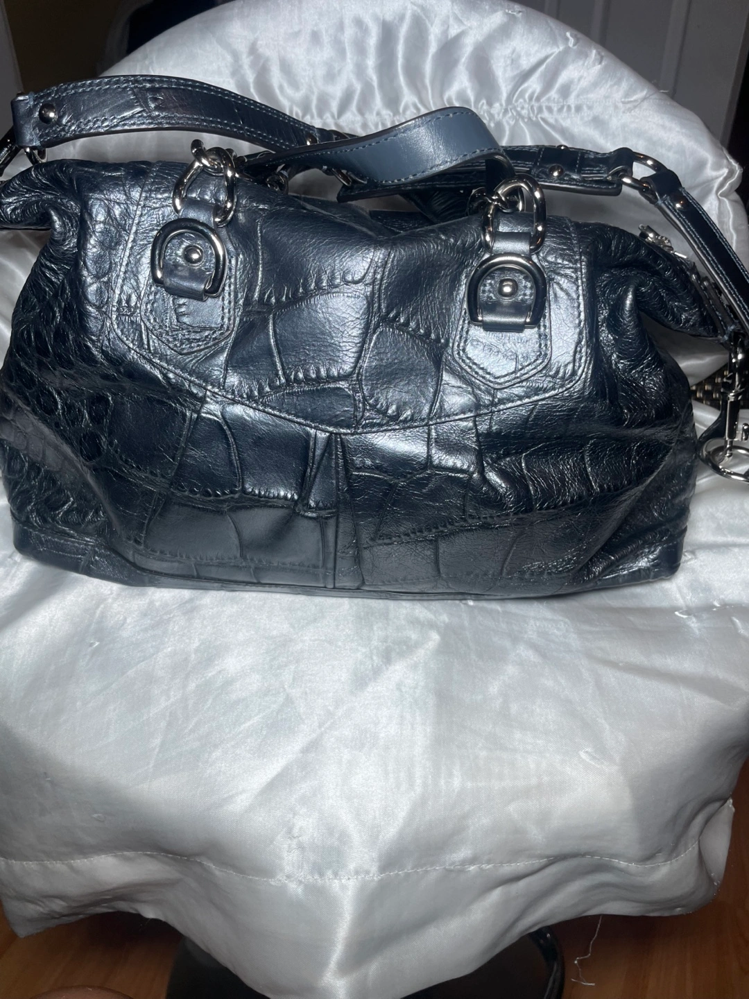 Selling a stylish Coach satchel in black leather! It features a unique crocodile-like pattern and silver hardware. The interior is lined with a lovely blue fabric. It's in great condition and ready for a new home!