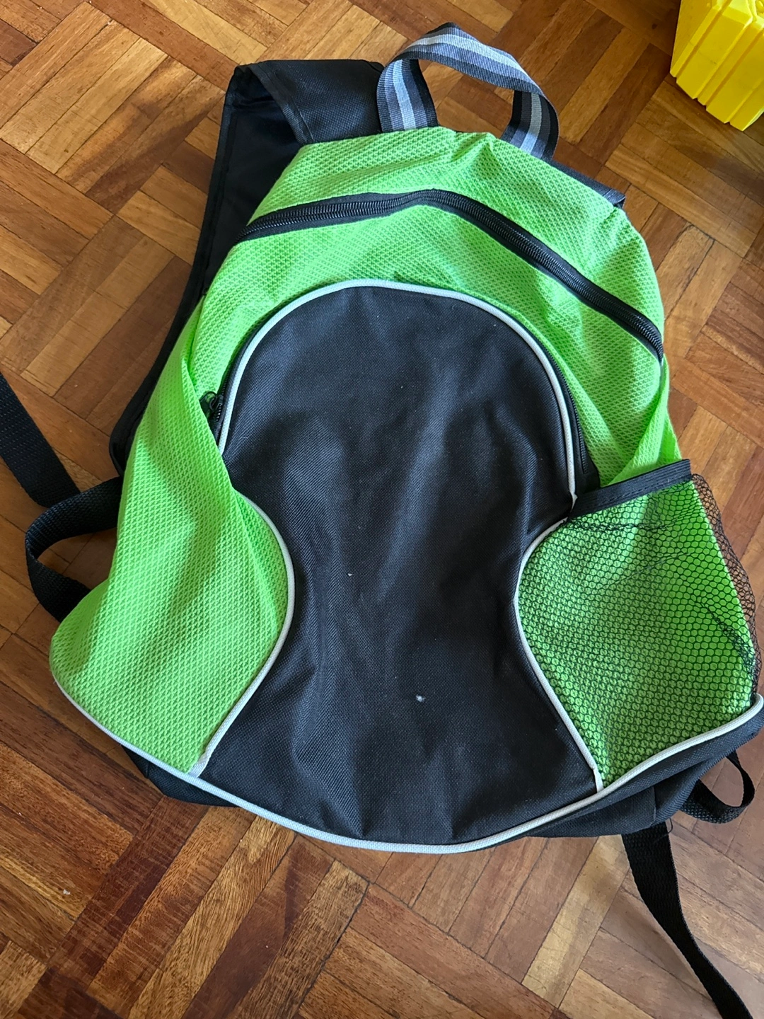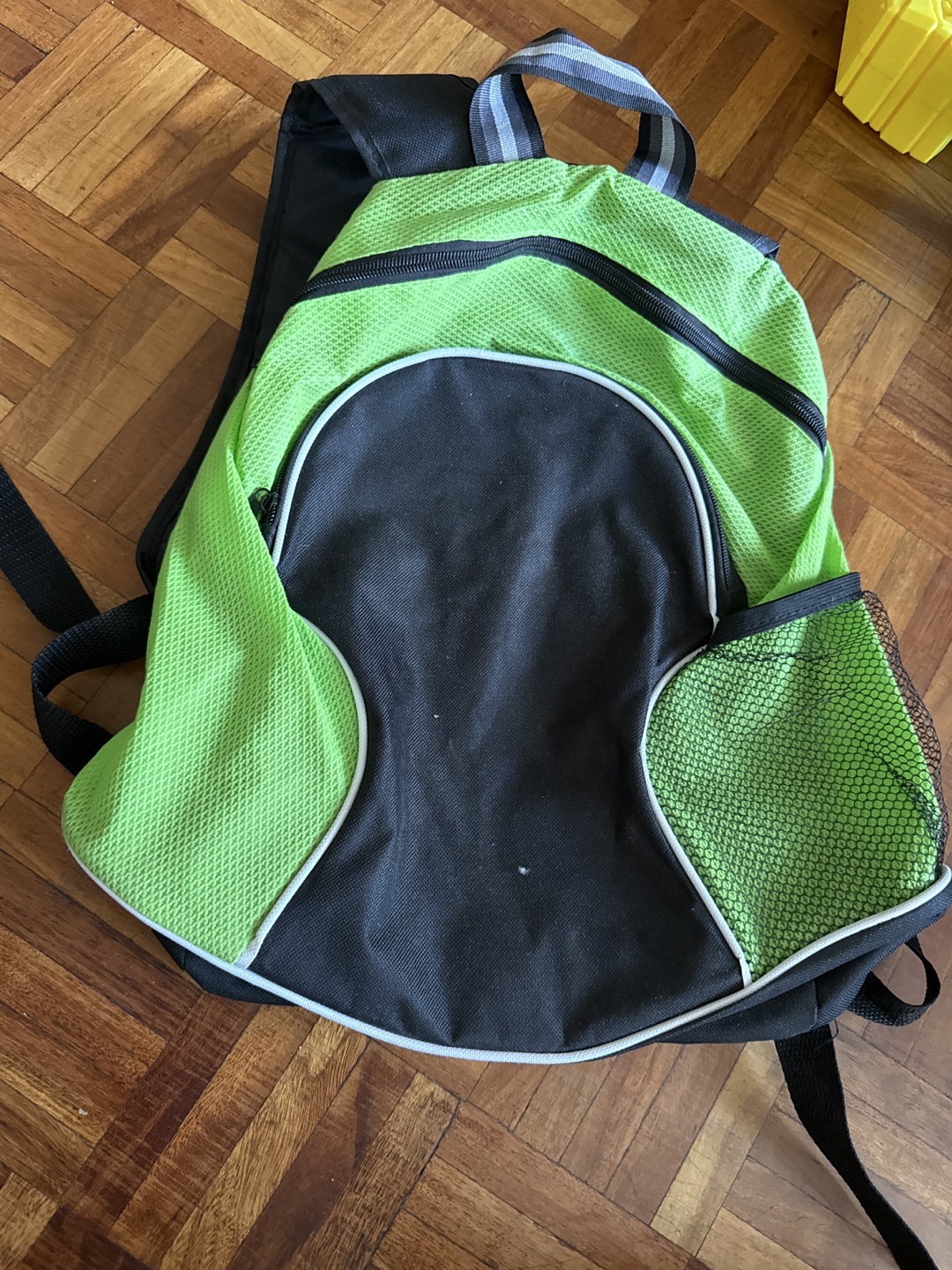 Selling a green and black backpack. It's in great condition and perfect for school, hiking, or everyday use! It has a mesh pocket on the side and adjustable straps
