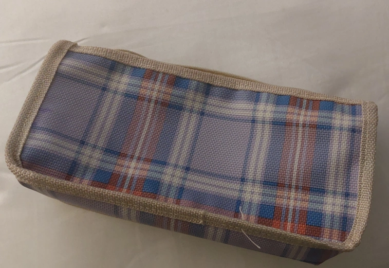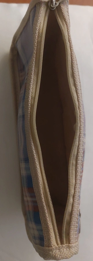 Here's a cute little zippered pouch with a plaid pattern. It's perfect for storing small items like makeup, pencils, or travel essentials. It's in great condition and ready for a new home!