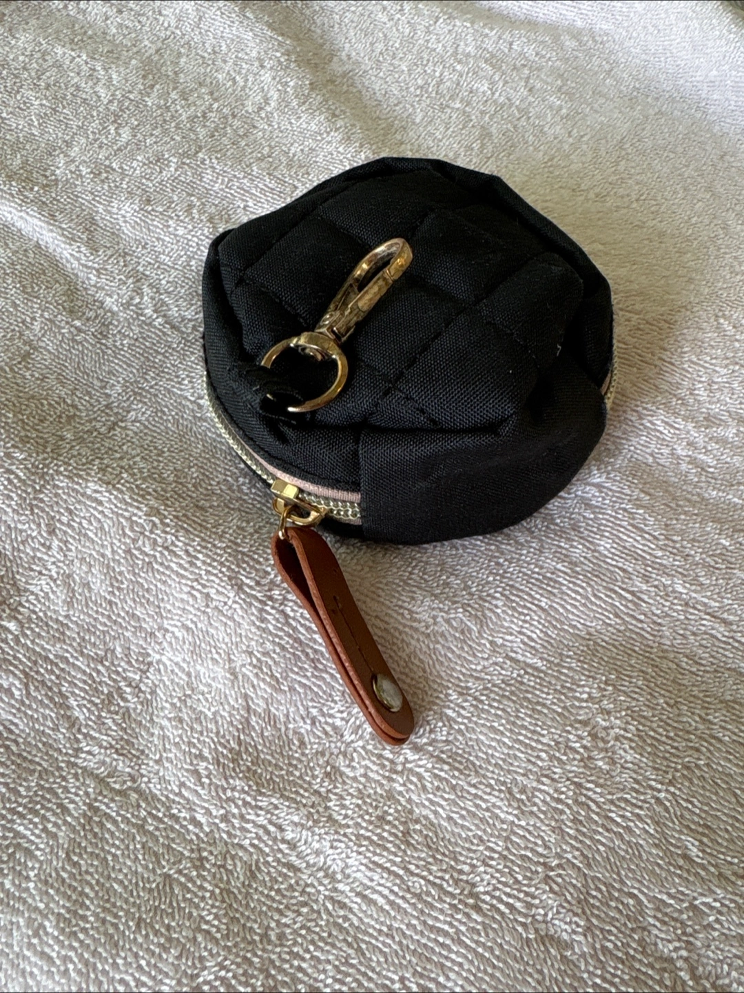 Cute little black quilted coin purse! It has a zipper closure and a key ring attached. Perfect for keeping your change or small items organized
