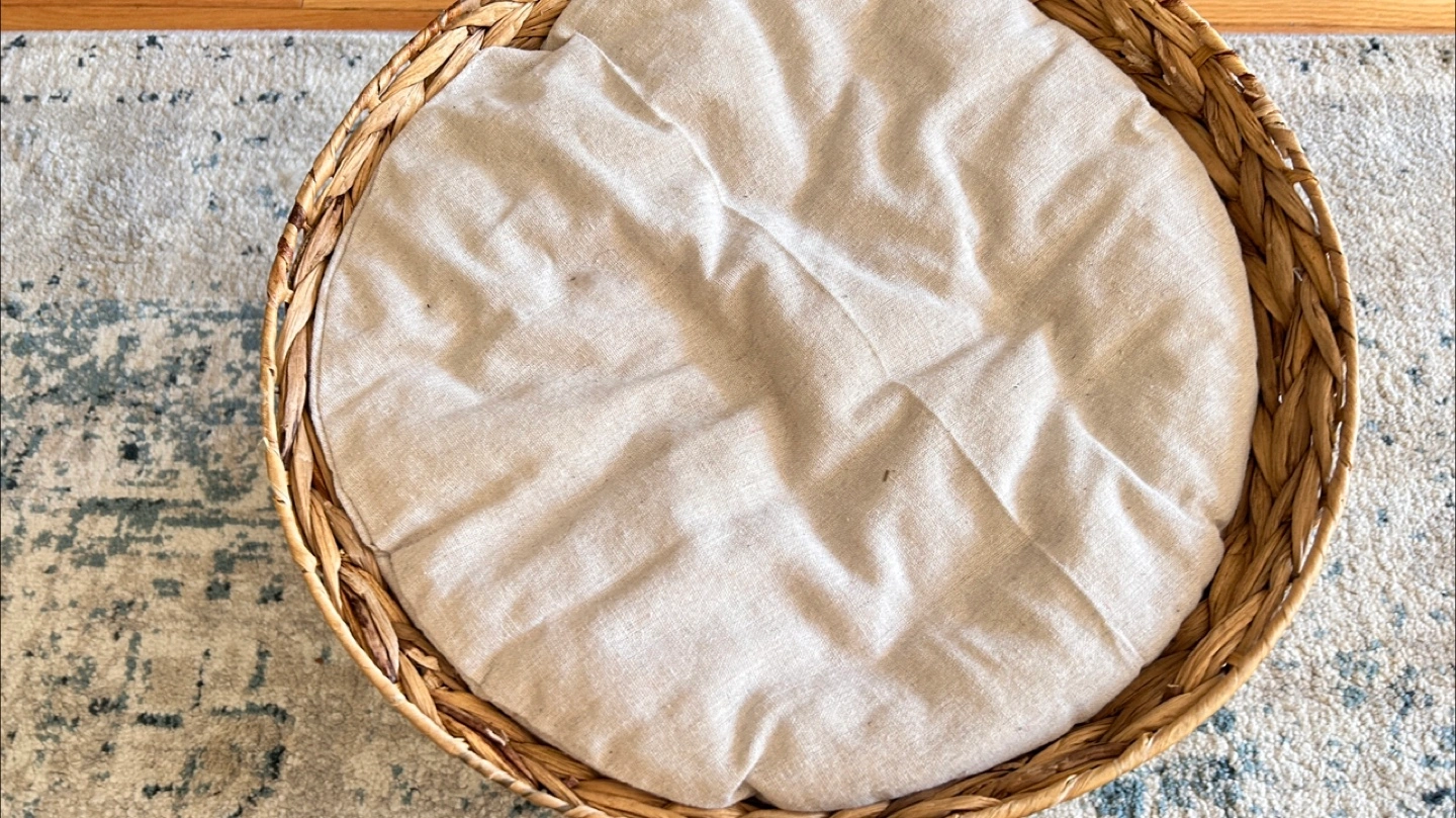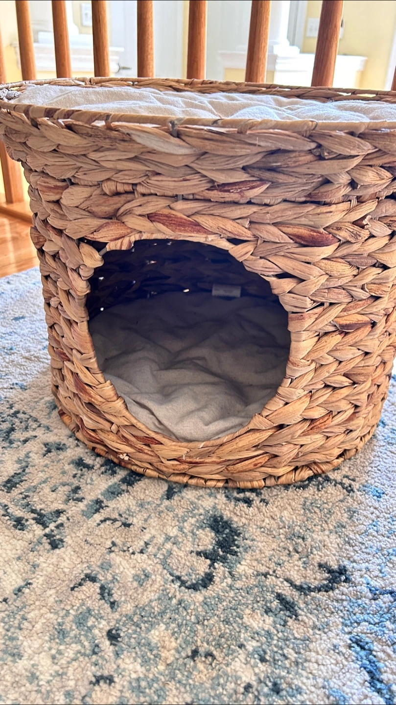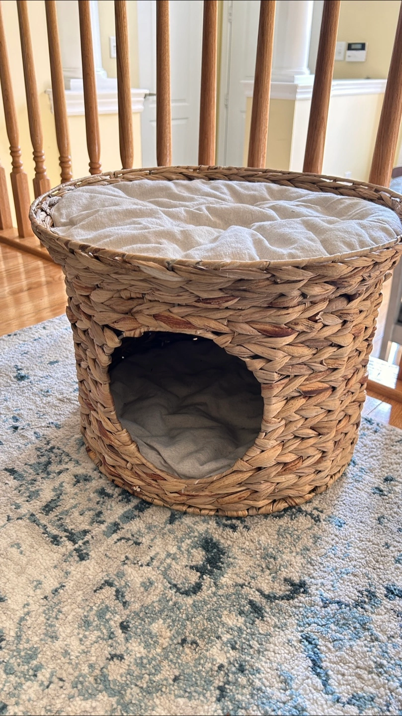 Selling this beautiful woven wicker-style cat house or pet bed. It has a circular opening in the front for the cat or small pet to enter and a cushioned top and inside, which can also be used as a lounging spot. It’s designed to give pets a cozy hideaway while also offering a soft surface to rest on top.