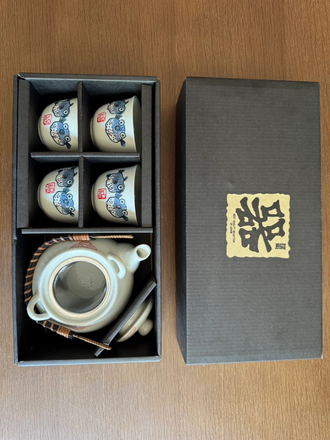 Selling a lovely Japanese tea set! It comes with a teapot, four cups, and a box for storage. The set features a unique fish design on each piece. Perfect for tea lovers! Never used!