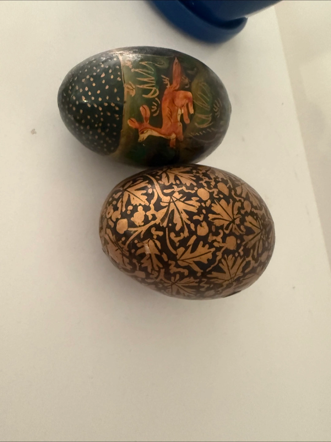 Giving away two decorative painted eggs for free One is dark green with a fox, and the other is gold with leaf patterns. They're lovely for adding a touch of artistry to your home! I have many more so thought to give away few to someone who likes to decorate