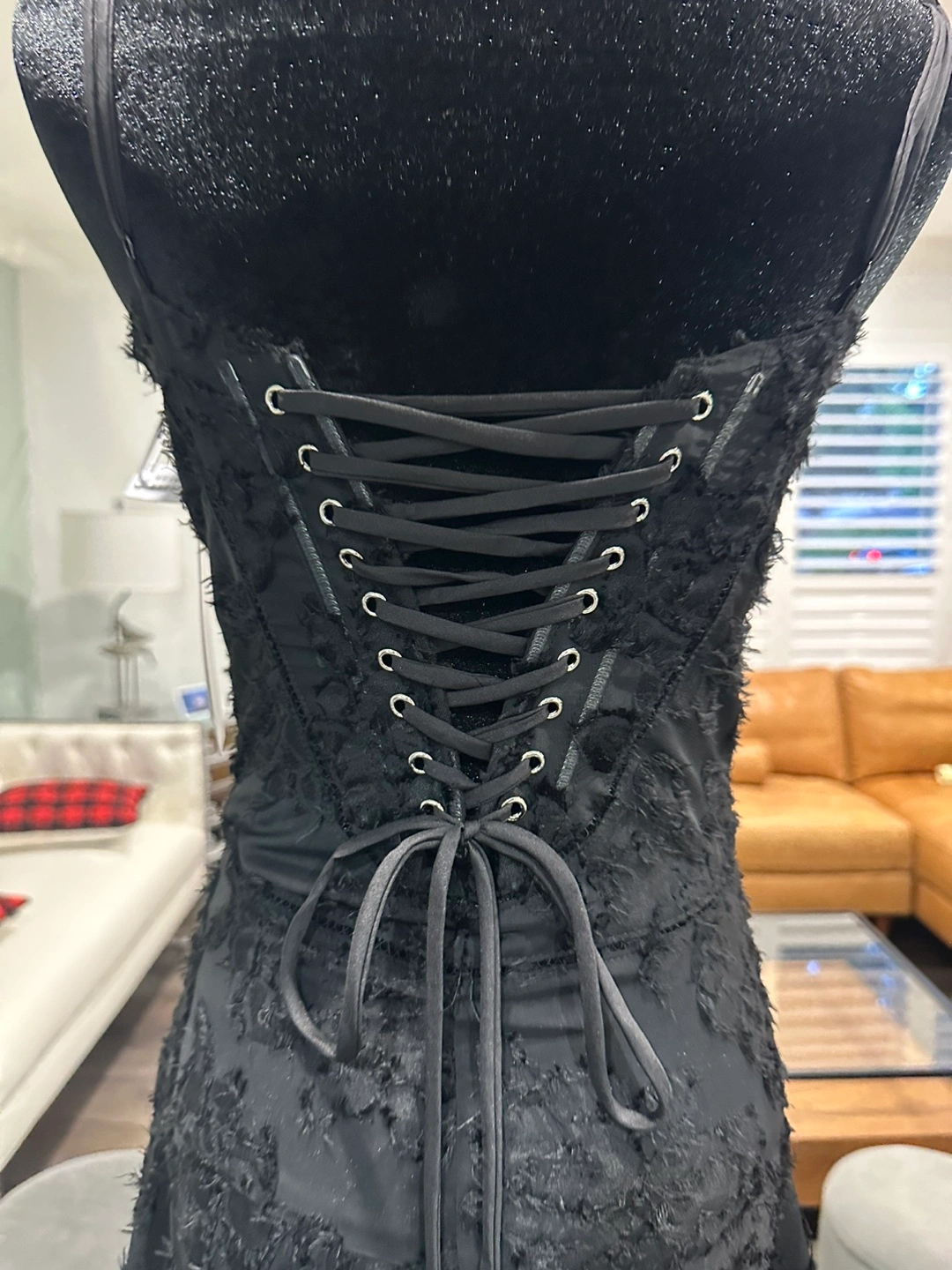 Beautiful black dress with lace detailing and a corset back. It's in great condition and ready for a new home!