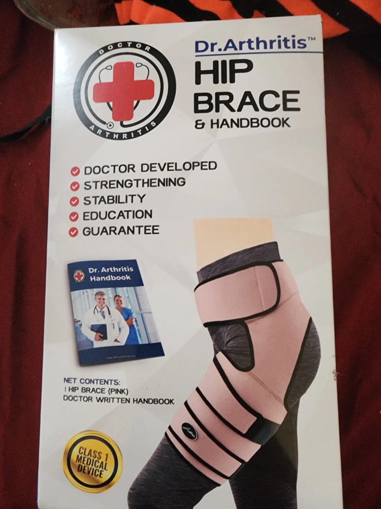 Selling a Dr. Arthritis Hip Brace & Handbook. The net contents include one pink hip brace and a doctor-written handbook. It's designed for doctor-developed strengthening, stability, education, and guarantee.