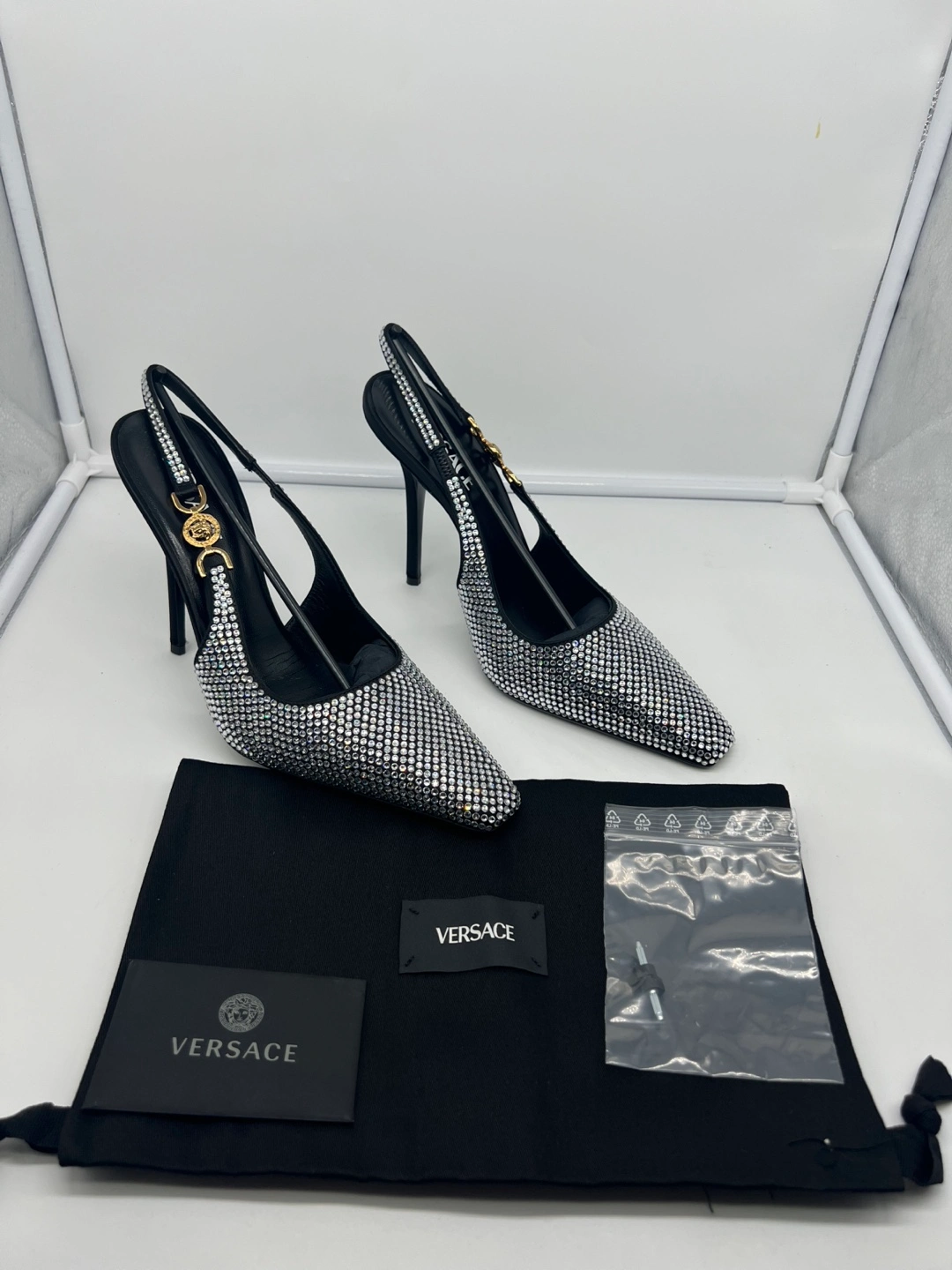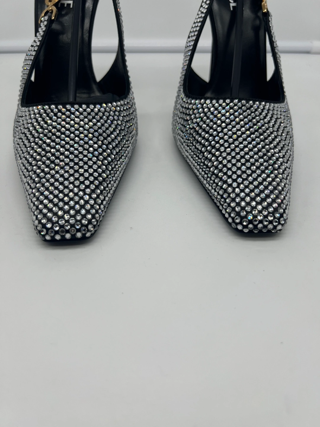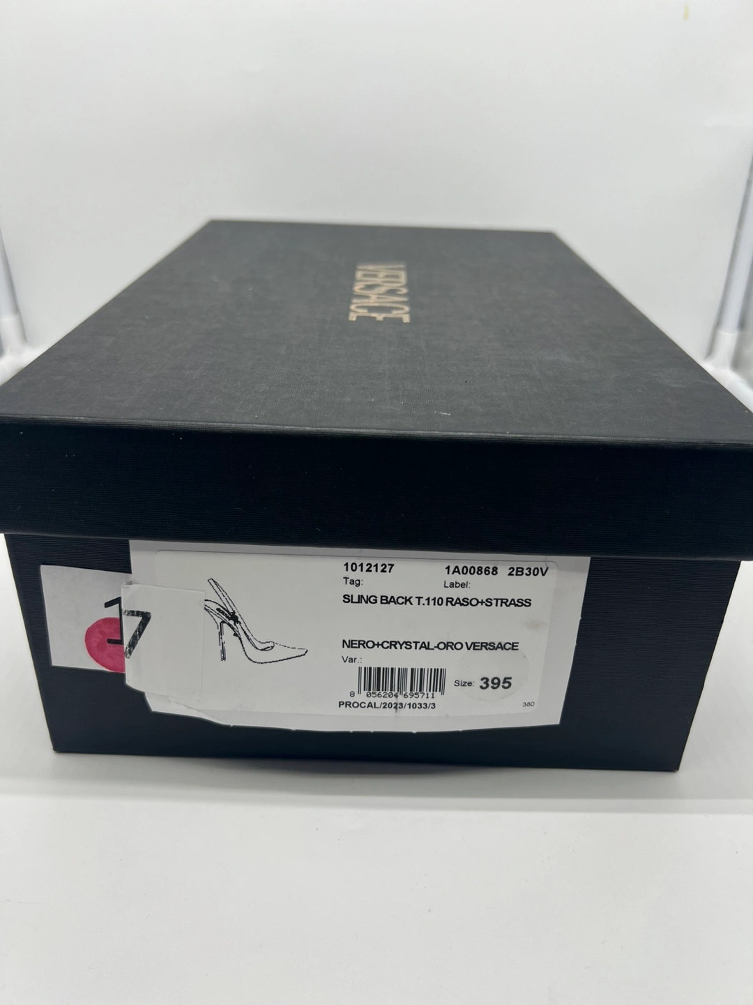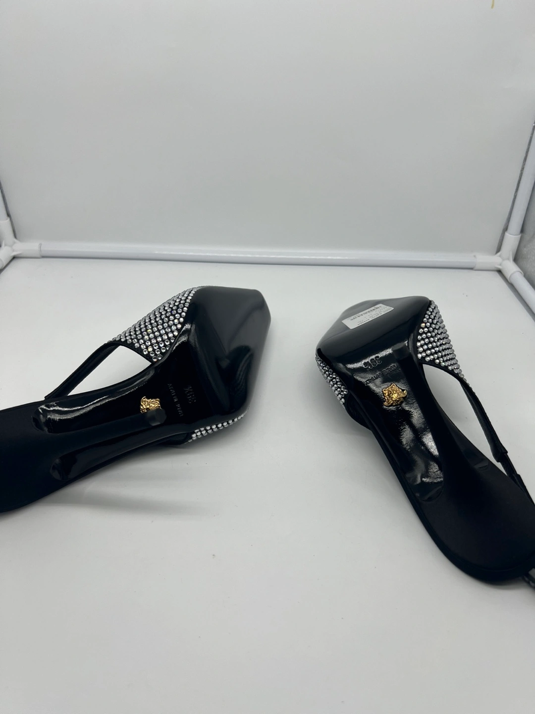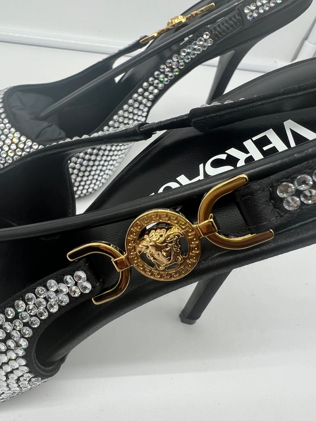 Versace Medusa Crystal Embellished Black Satin Slingback sz 39.5