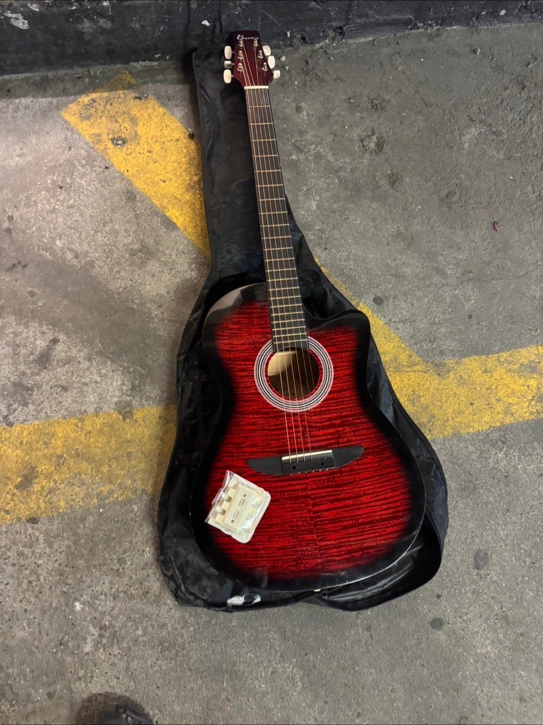Selling a Valencia acoustic guitar in a lovely red and black finish. It comes with a case and a set of replacement bridge pins. Great for beginners or anyone looking for a nice acoustic guitar!