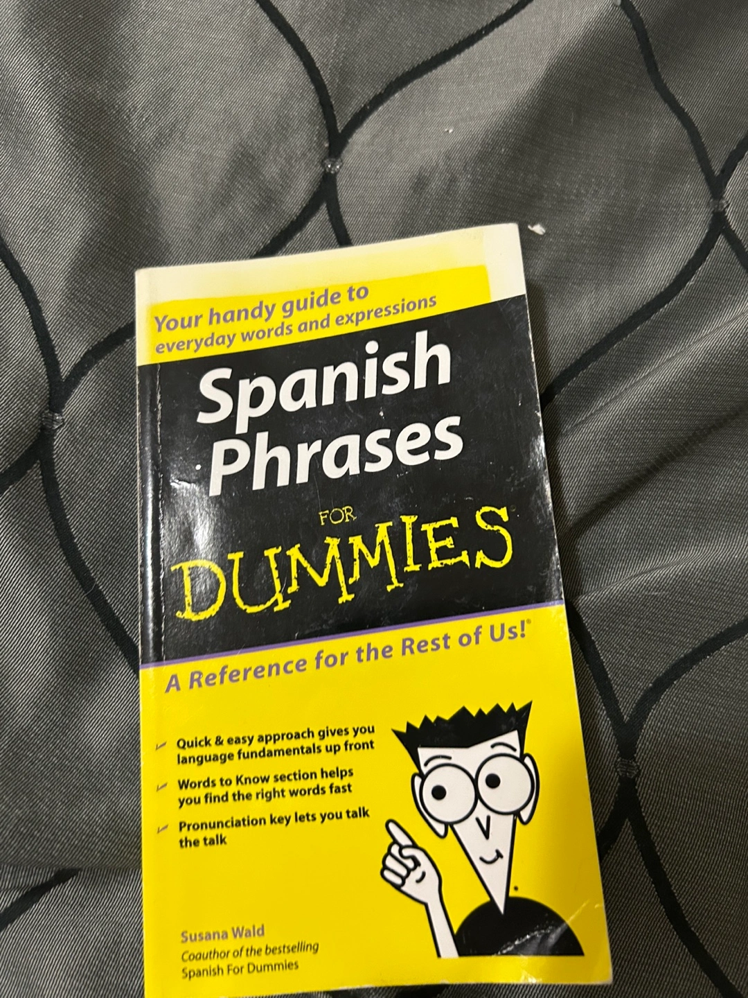 Selling a copy of "Spanish Phrases for Dummies" by Susana Wald. It's a handy guide to everyday Spanish words and expressions. This book offers a quick and easy approach to learning language fundamentals, and a pronunciation key to help you talk the talk