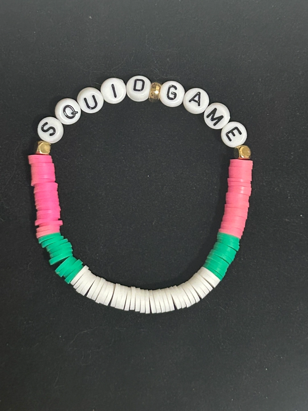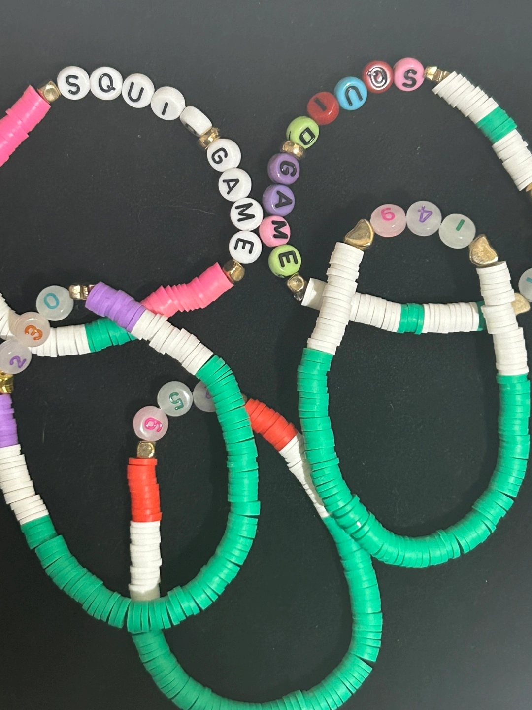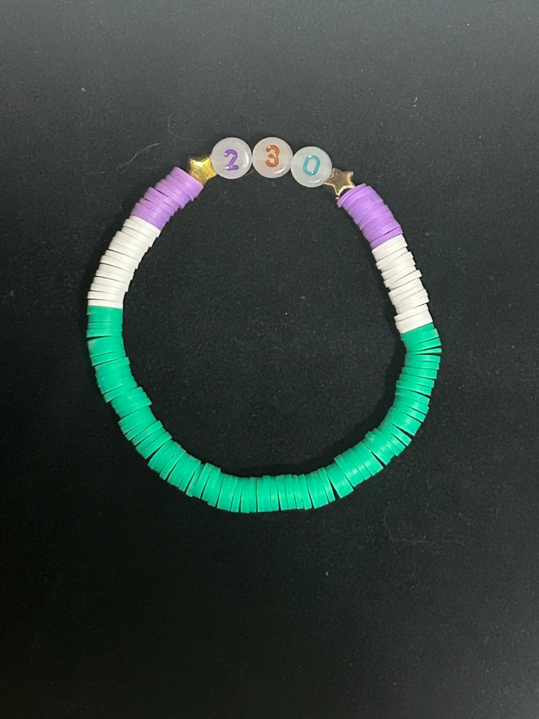 Handmade beaded bracelet with colourful discs and lettered beads. Perfect for adding a pop of fun to any outfit!
