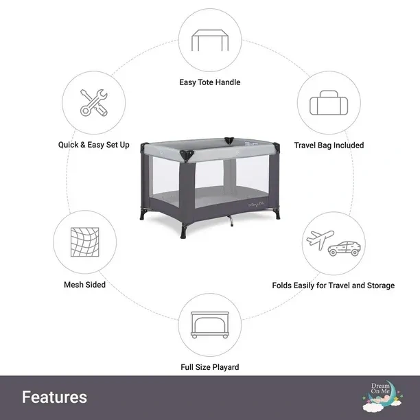 97Brand new in box The Dream On Me Nest Portable Play Yard, 436 is an award-winning hassle-free playard - the perfect blend of safety and convenience at the best possible price. The Dream On Me Nest Portable Play Yard, 436 offers unmatched convenience and portability. Its lightweight aluminum frame allows you to carry it around easily indoors, ensuring your child is always nearby. Assembly is fuss-free and takes seconds, thanks to a no-tool assembly and quick fold mechanism. Product dimensions are 40Lx28W x 27.50H inches; weight 17 pounds. It is intended for children under 36″ inches in height (or when a child is able to climb out). AWARD WINNING FEATURES: A full-size playard, the Nest is spacious, safe and loaded with convenient features. It’s portable, stylish, stores compactly and ideal for play. Little wonder then that it was a winner at the 2020 National Parenting Product Awards MOBILE & STURDY: Its lightweight aluminum frame allows easy mobility. Set-up is easy and takes seconds, thanks to a quick fold mechanism and no tool assembly. It folds & stores compactly in the tote bag provided making it the ideal travel accessory BREATHABLE MESH: The Nest Playard is made of soft and safe polyester foam fabric. Its four airy mesh sides allow easy ventilation and allow 360° visibility for your child, making your child feel secure and allowing you to keep an eye on your baby as well PRIORITIZING SAFETY. ALWAYS: The Nest Playard meets all applicable CPSC/ASTM standards. It’s intended for children under 36″ inches in height (or when a child is able to climb out). It comes with a folding mattress pad for your baby to play or nap on STYLISH DESIGN: The Nest boasts a modern, clean design. It is available in 5 finishes that complement any room décor. Product dimensions are 40L x 28W x 27.50H inches; it weighs 17 pounds. To clean, simply wipe with a damp cloth and allow to air dry