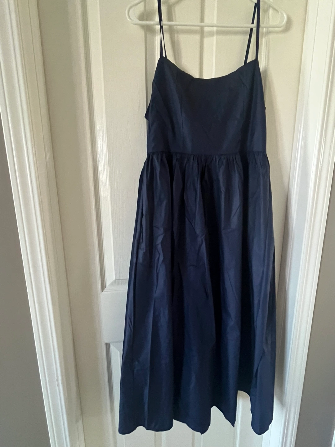 A simple navy blue sundress! It's in great condition and perfect for summer days. The dress features adjustable straps and a comfortable fit. It's a versatile piece that can be dressed up or down for any occasion