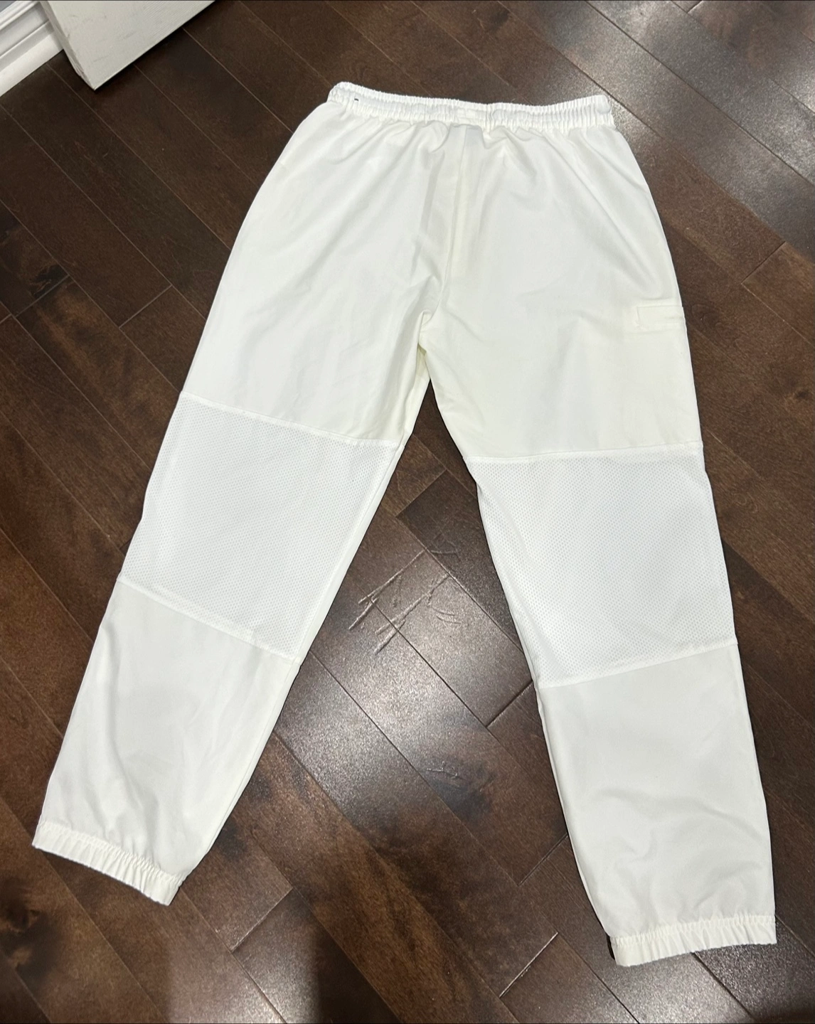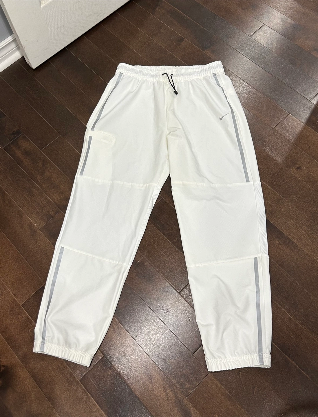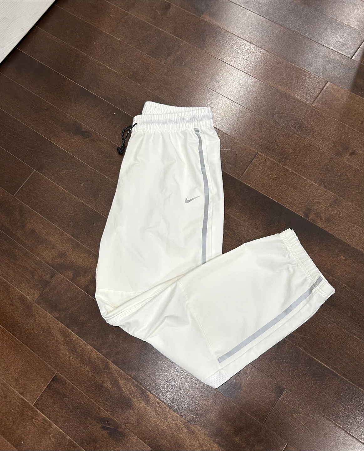 Crisp white athletic track pants with a minimalist design. classic Nike swoosh. Size medium women’s. Baggy fit. Drawstring, some mesh detailing. Early 2010s hence there may be flaws I have missed but in excellent condition. Has not been worn.