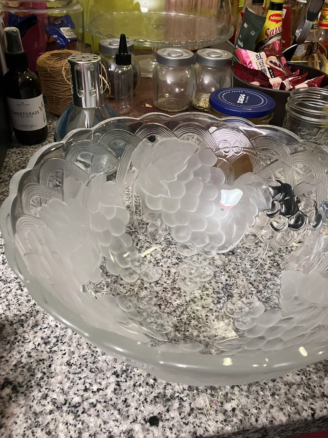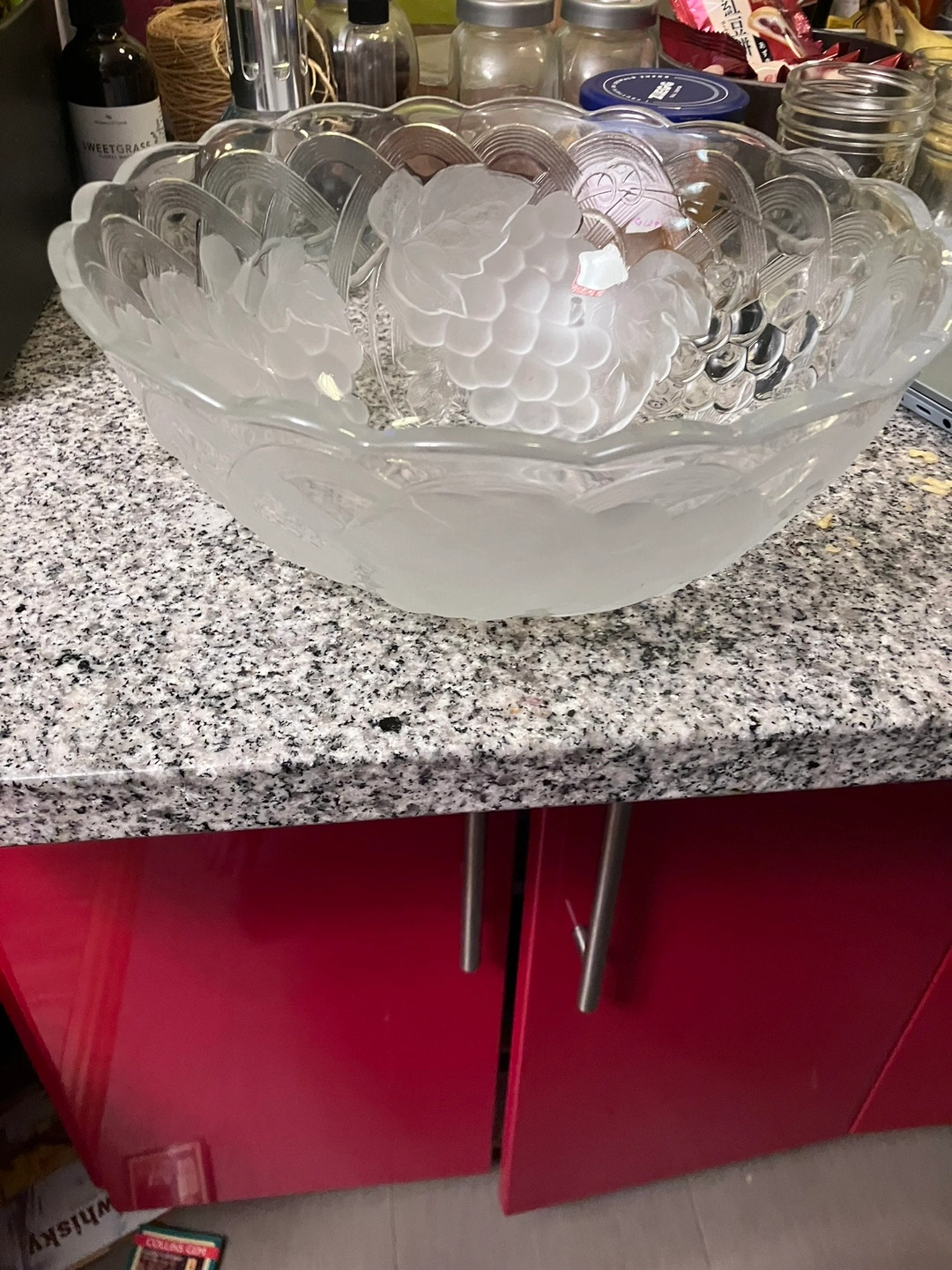 Selling a beautiful large 12” wide glass bowl featuring a lovely grape design. It's perfect for serving salads, fruit, or as a decorative piece. It's in great condition and ready to brighten up your kitchen or dining room.