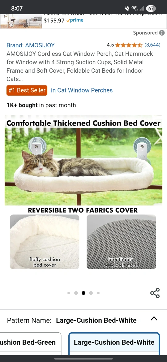 Selling an AMOSIJOY cat window perch with a large cushion bed in white. It features strong suction cups and is easy to assemble. The cover is reversible, with one side being a fluffy cushion and the other a breathable sandwich mesh. It easily folds up and has a high-grade steel frame. pick up only