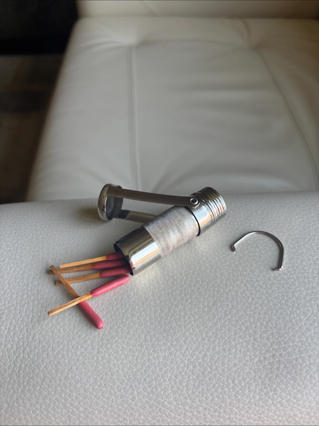 Selling a vintage match holder used for keeping matches dry on camping trips. It has a unique design and is in good condition. Pickup only in the St Lawrence market area of downtown Toronto.