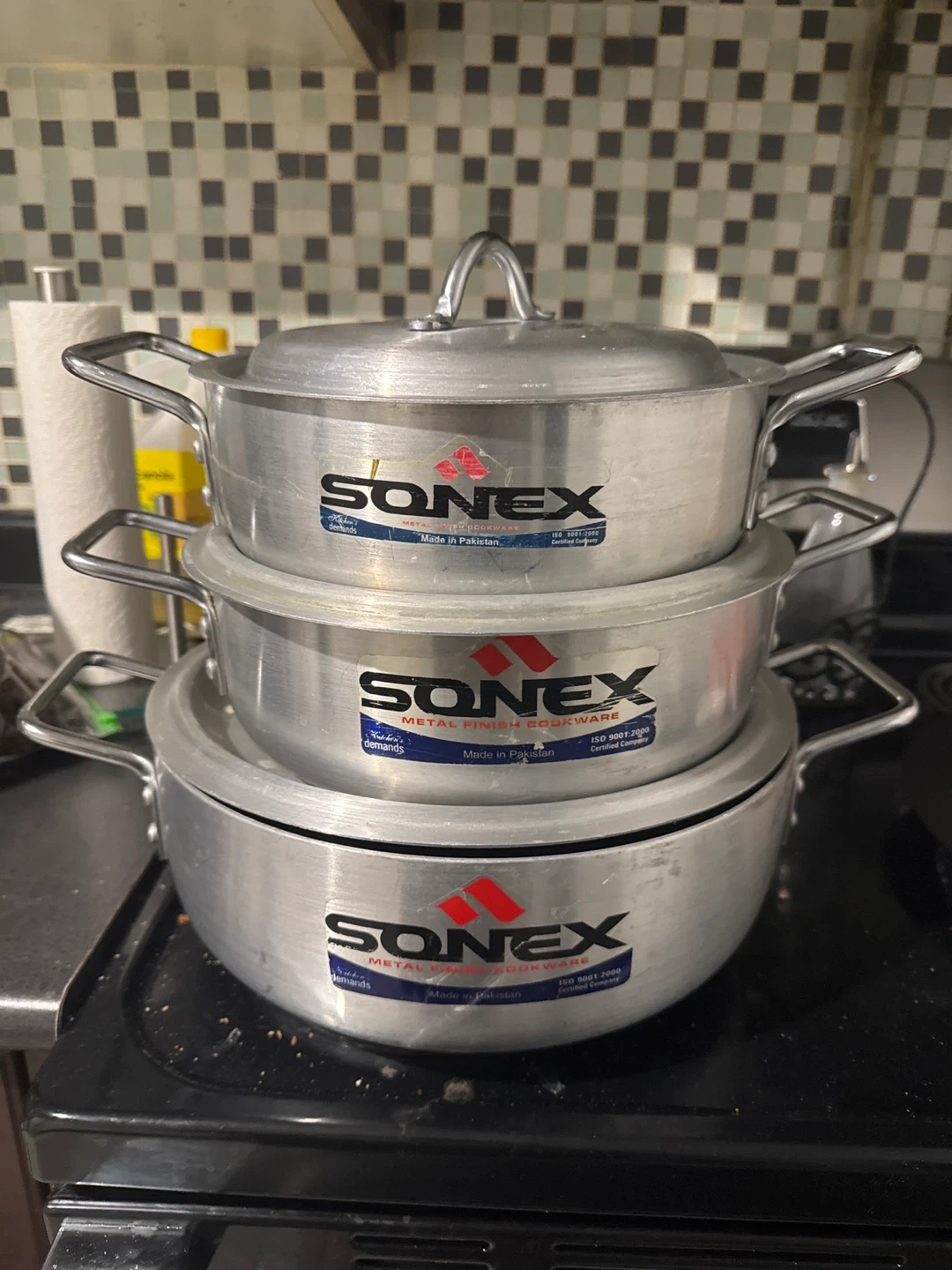 This is a set of three Sonex metal finish cookware pots. Pots are made in Pakistan. They're suitable for everyday cooking needs.