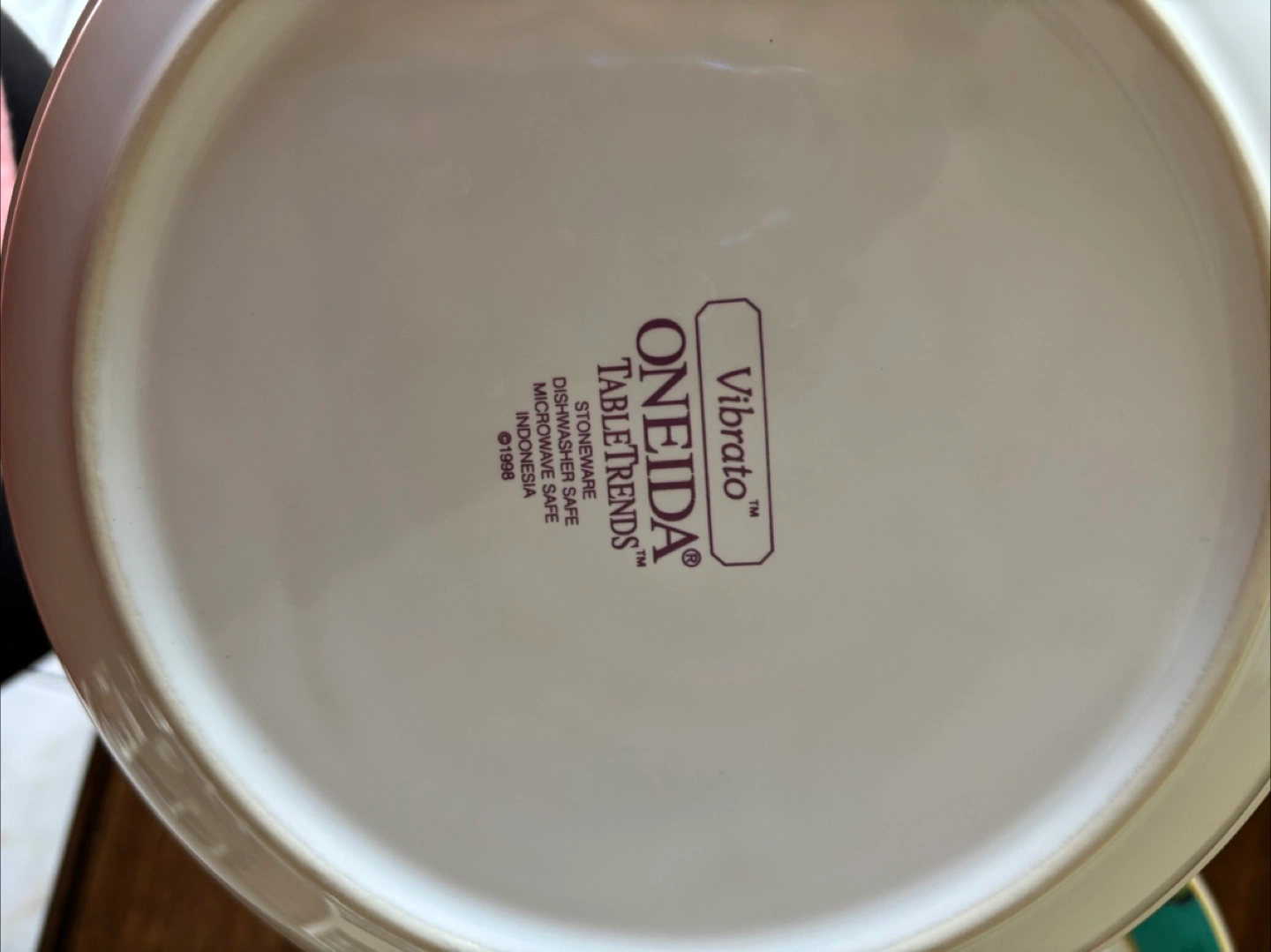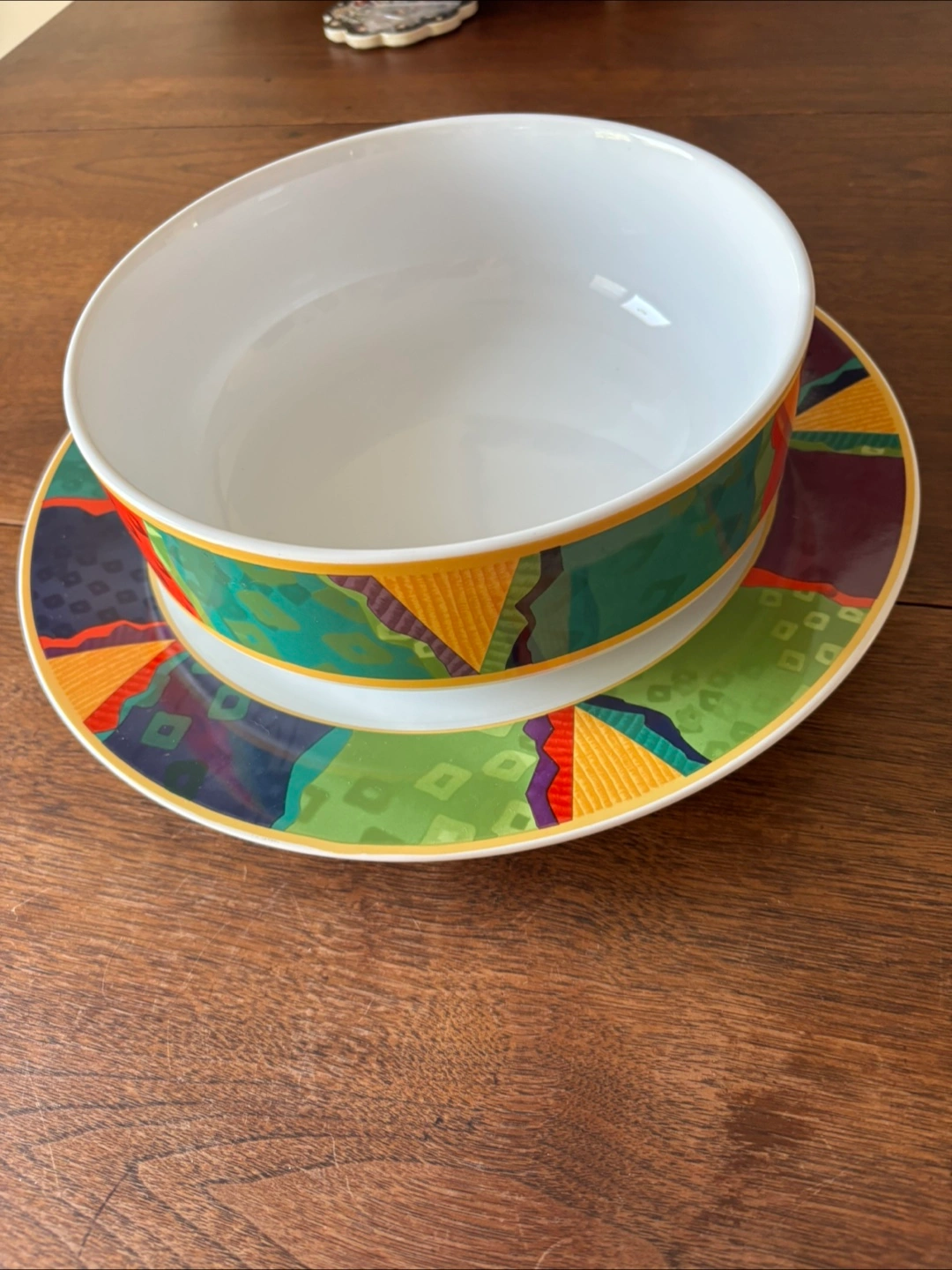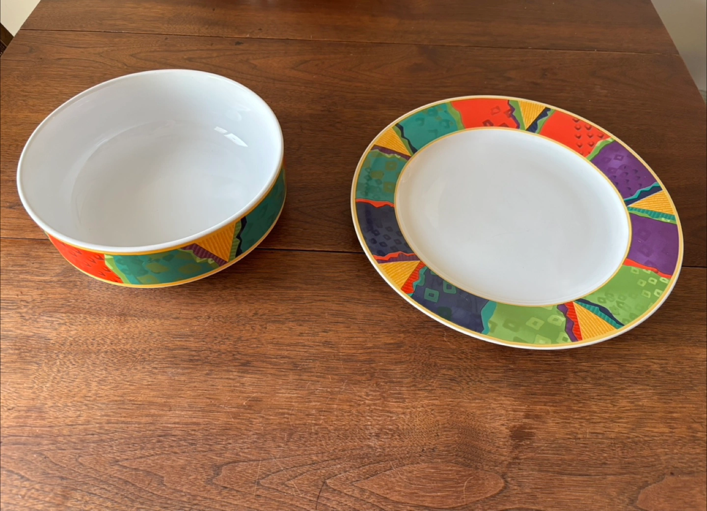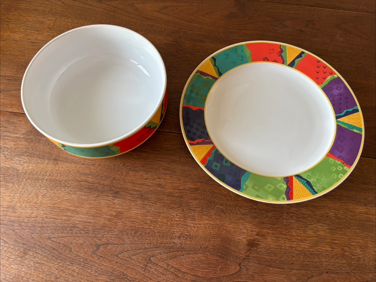 Selling a bowl and plate set. They have a unique pattern with colours including green, red, yellow, and purple. Perfect for adding a pop of colour to your table!