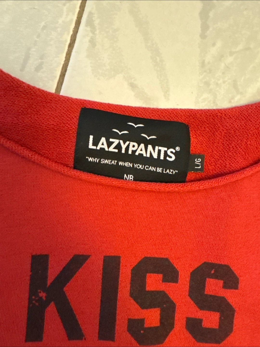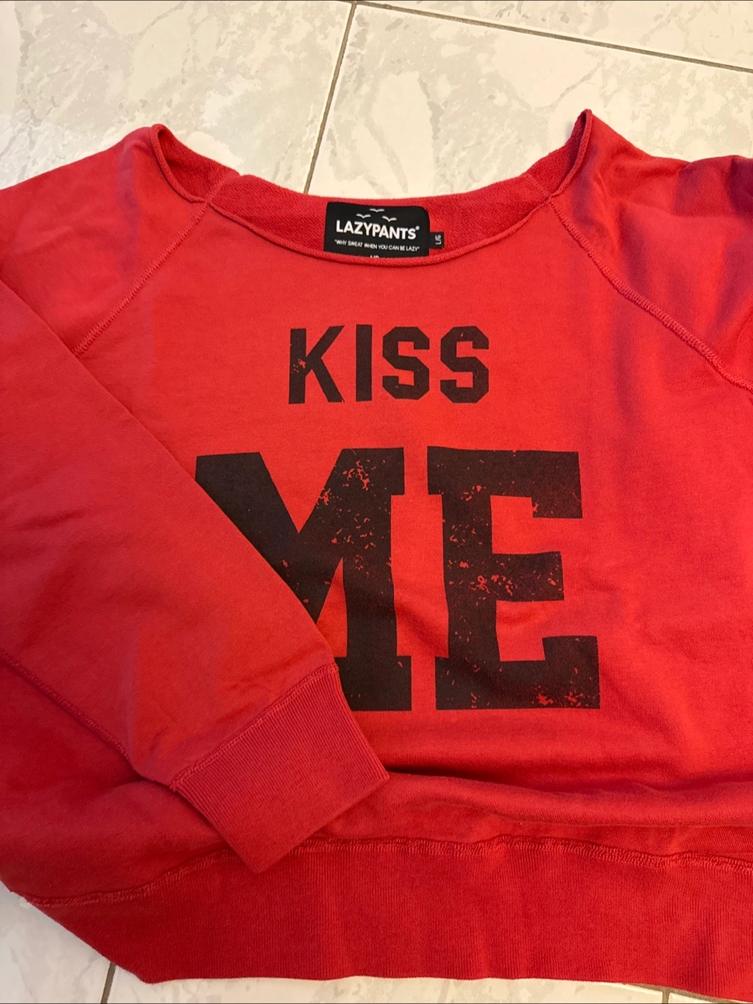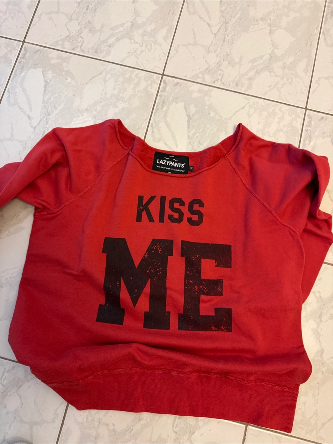 Cozy red LazyPants sweatshirt with a 'Kiss Me' design! It's a size L Perfect for lounging or casual wear. The material is soft and comfy, ideal for everyday wear!