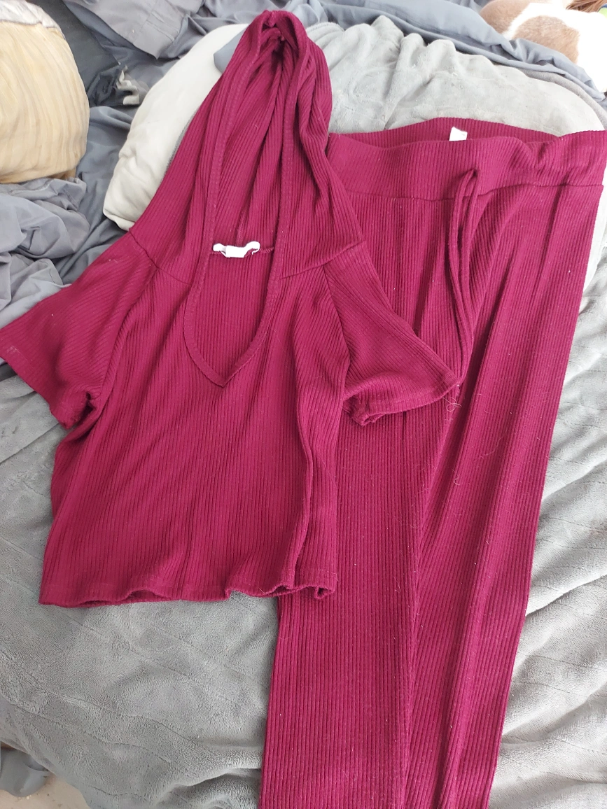 Cozy burgundy set, Includes a short-sleeved top and comfortable pants. Great for lounging around the house on those chilly days