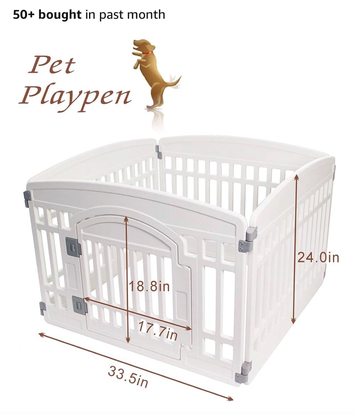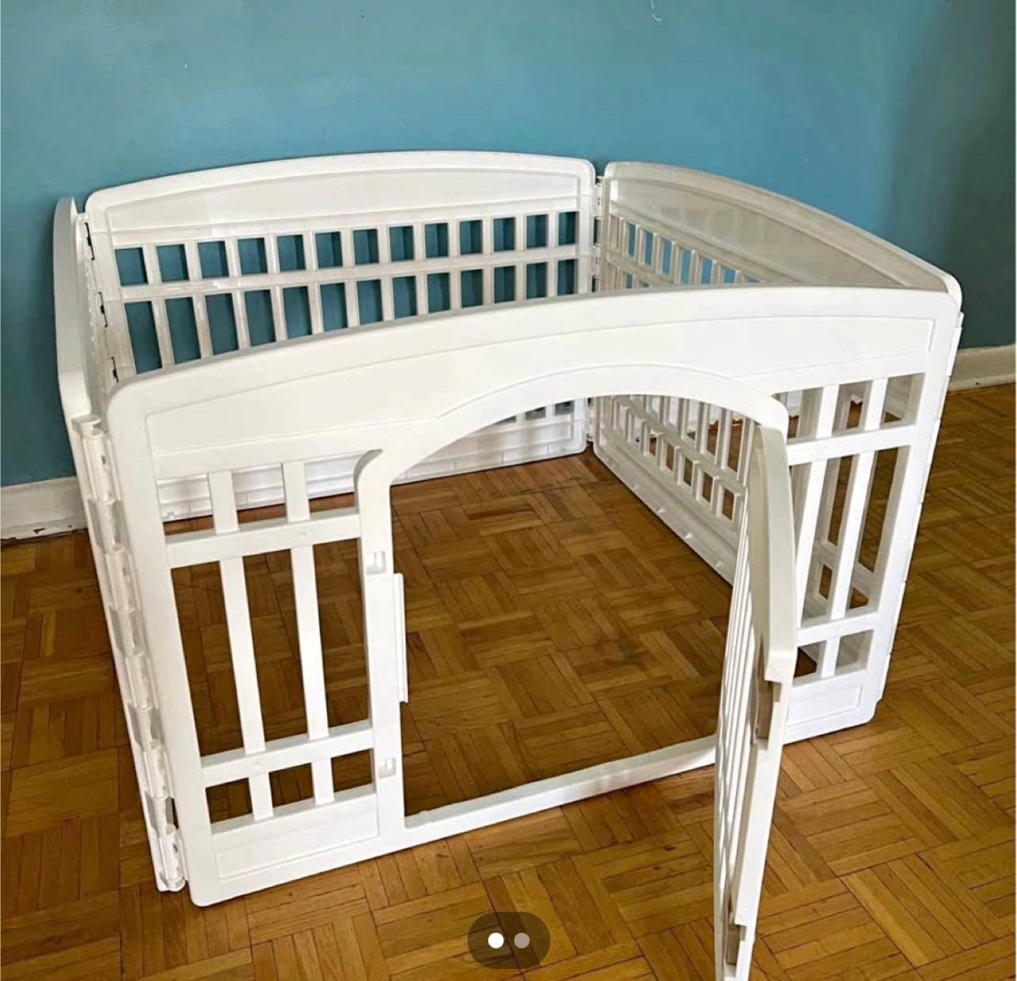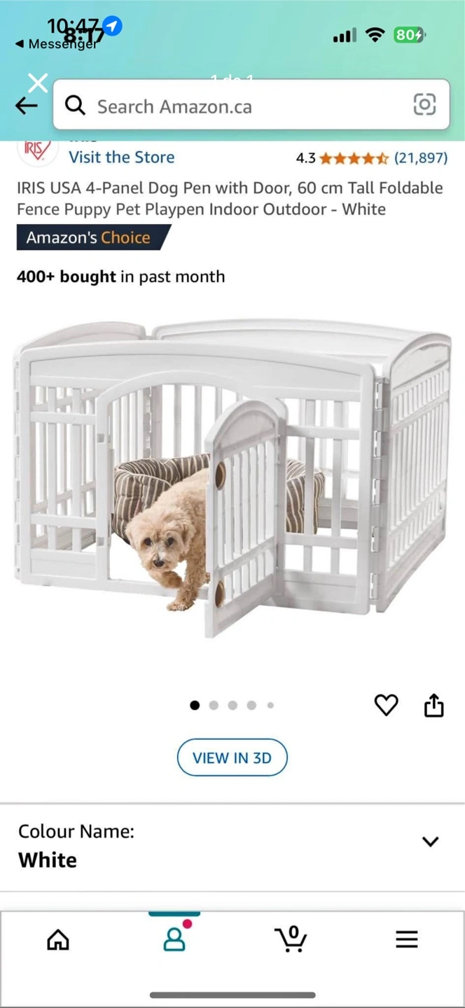 Selling an IRIS USA 4-panel dog pen with a door! It's a 60 cm tall foldable fence, perfect for puppies and pets, and suitable for indoor or outdoor use. The playpen is white and provides a safe and secure space for your furry friend. Dimensions are approximately 33.5in x 24.0in.