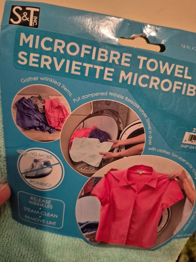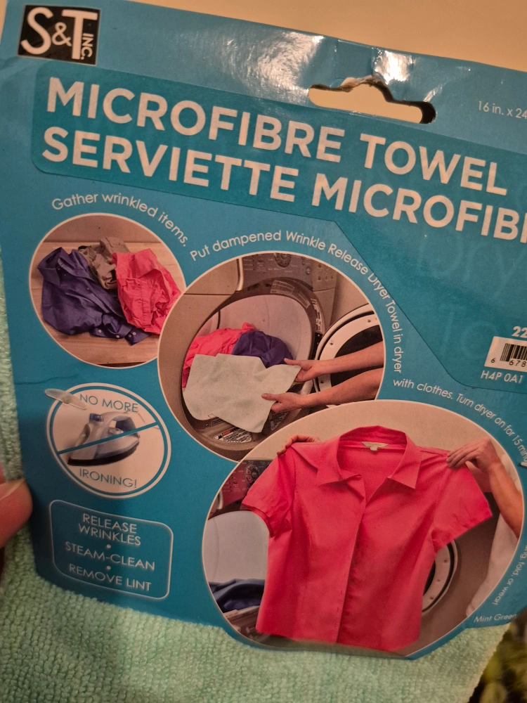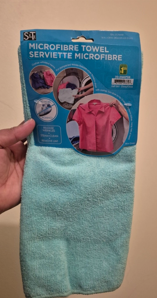 Brand new S&T microfibre towel, still in its original packaging! This towel is designed to gather wrinkled items and release wrinkles with steam cleaning. It's a great way to remove lint and reduce ironing. The towel measures 16 inches by 24 inches.