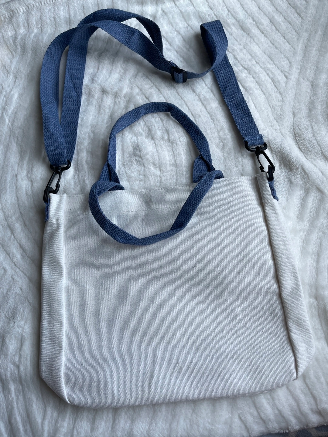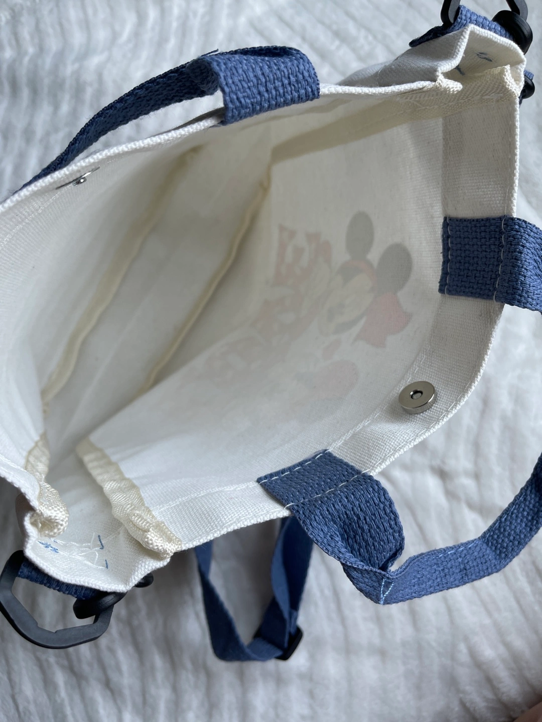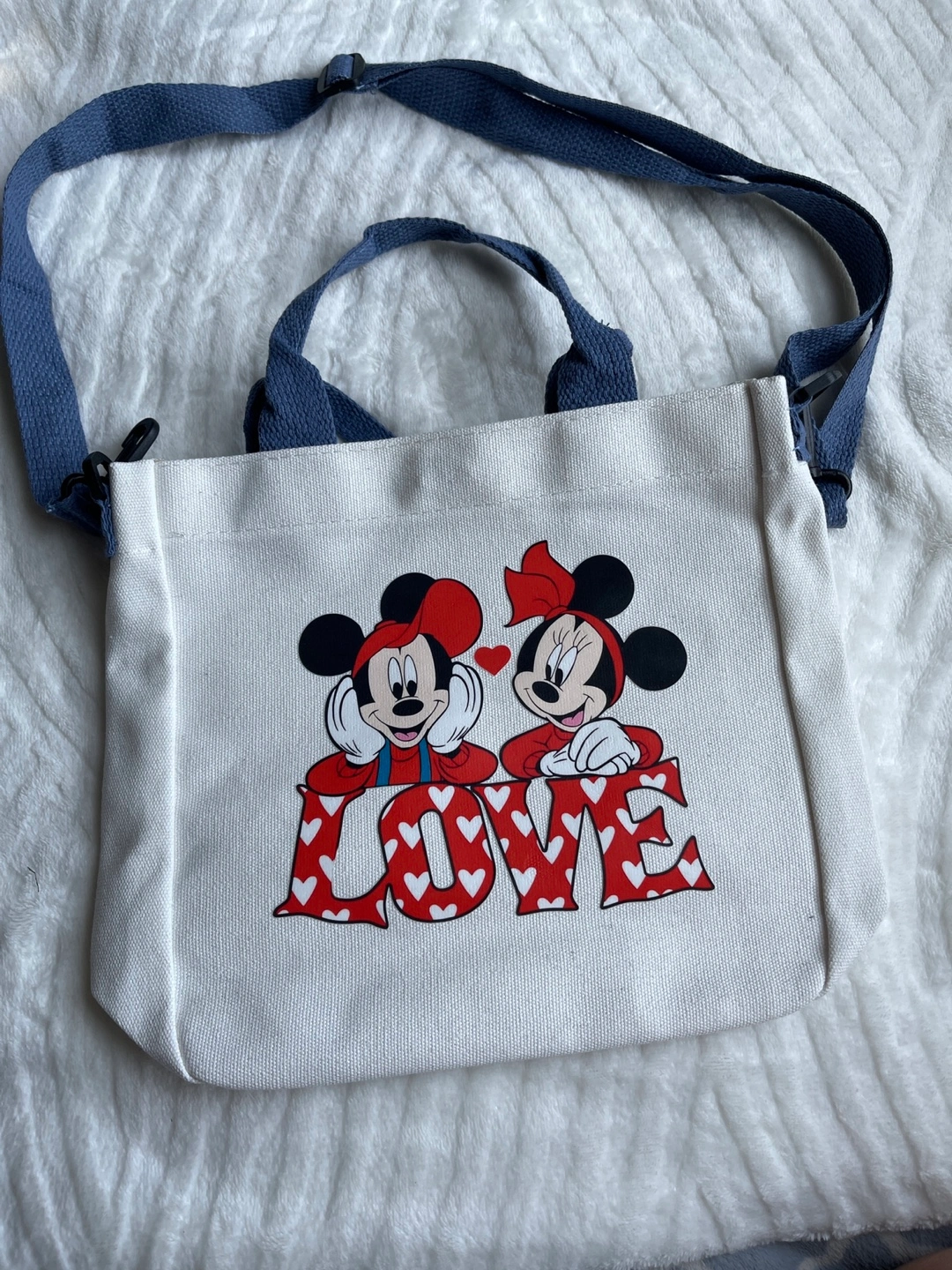 Super cute Disney tote bag featuring Mickey and Minnie Mouse! It's a canvas bag with a blue shoulder strap and handles. Perfect for carrying your essentials around town or adding a touch of Disney magic to your day