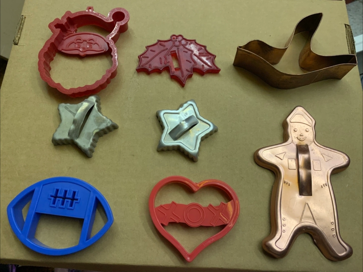 Selling a collection of cookie cutters in various fun shapes! You'll find a Santa, holly leaf, bird, stars, a football, a heart, and a gingerbread man. Perfect for baking up some delightful treats! 25 cents each. All for $2.