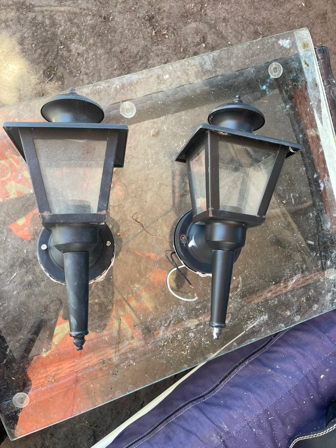 Selling a pair of outdoor wall mount lanterns. They're in good condition and would look great on a porch or entryway. Perfect for adding some light and charm to your outdoor space!