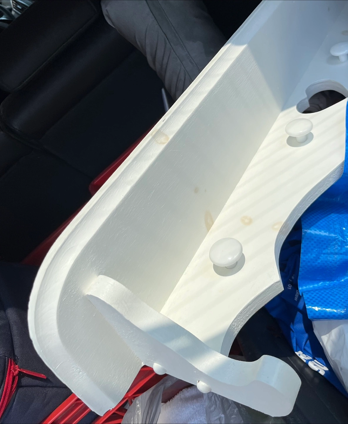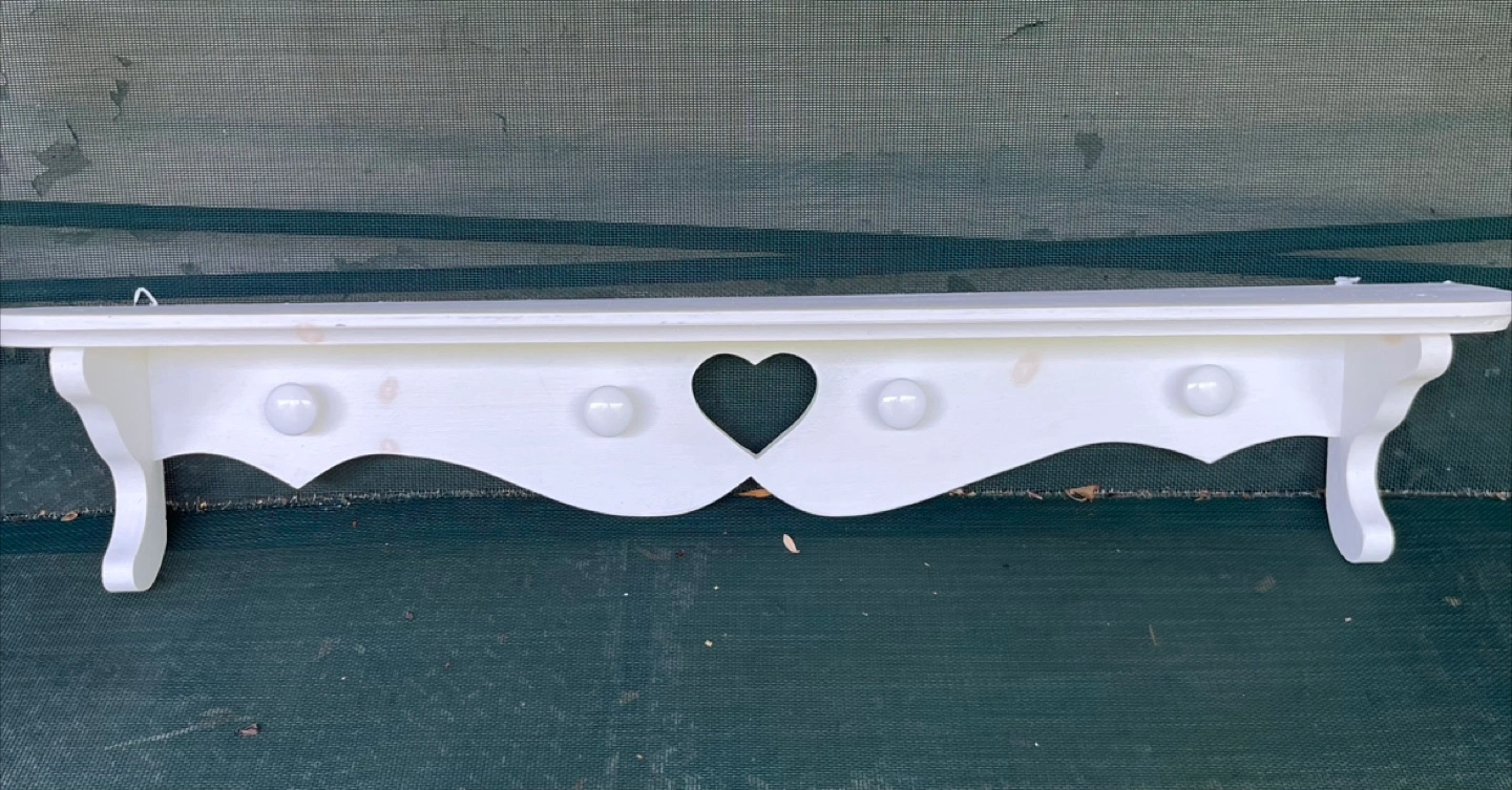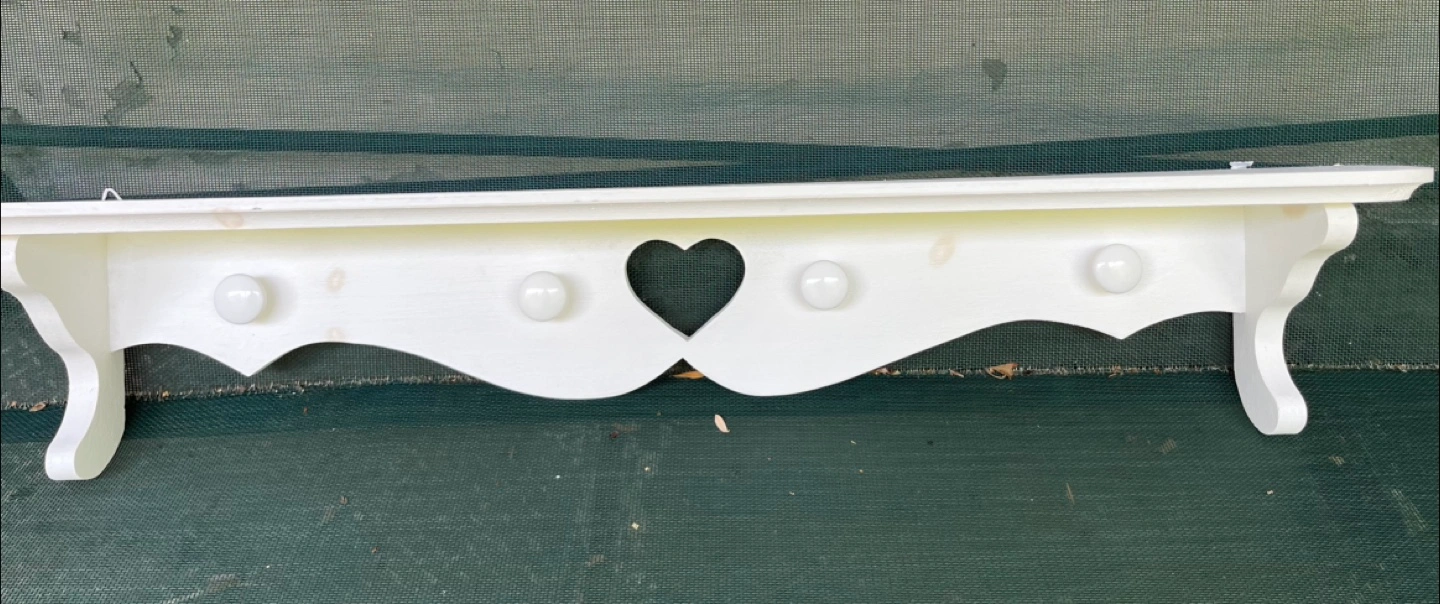 Selling a cute white wooden shelf! It has a sweet heart detail in the middle and little knob hooks for hanging!