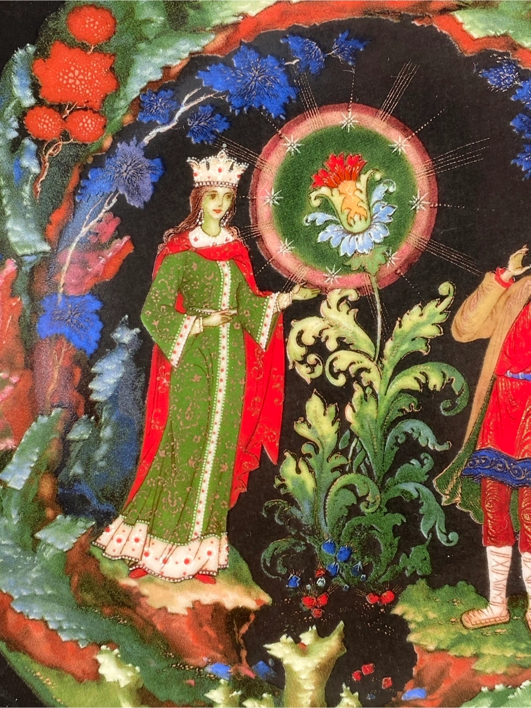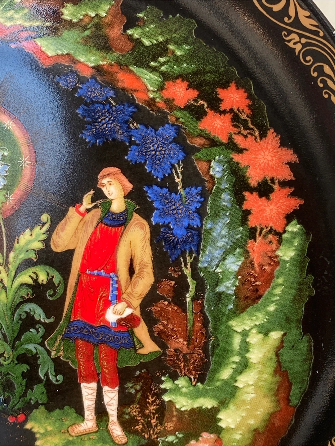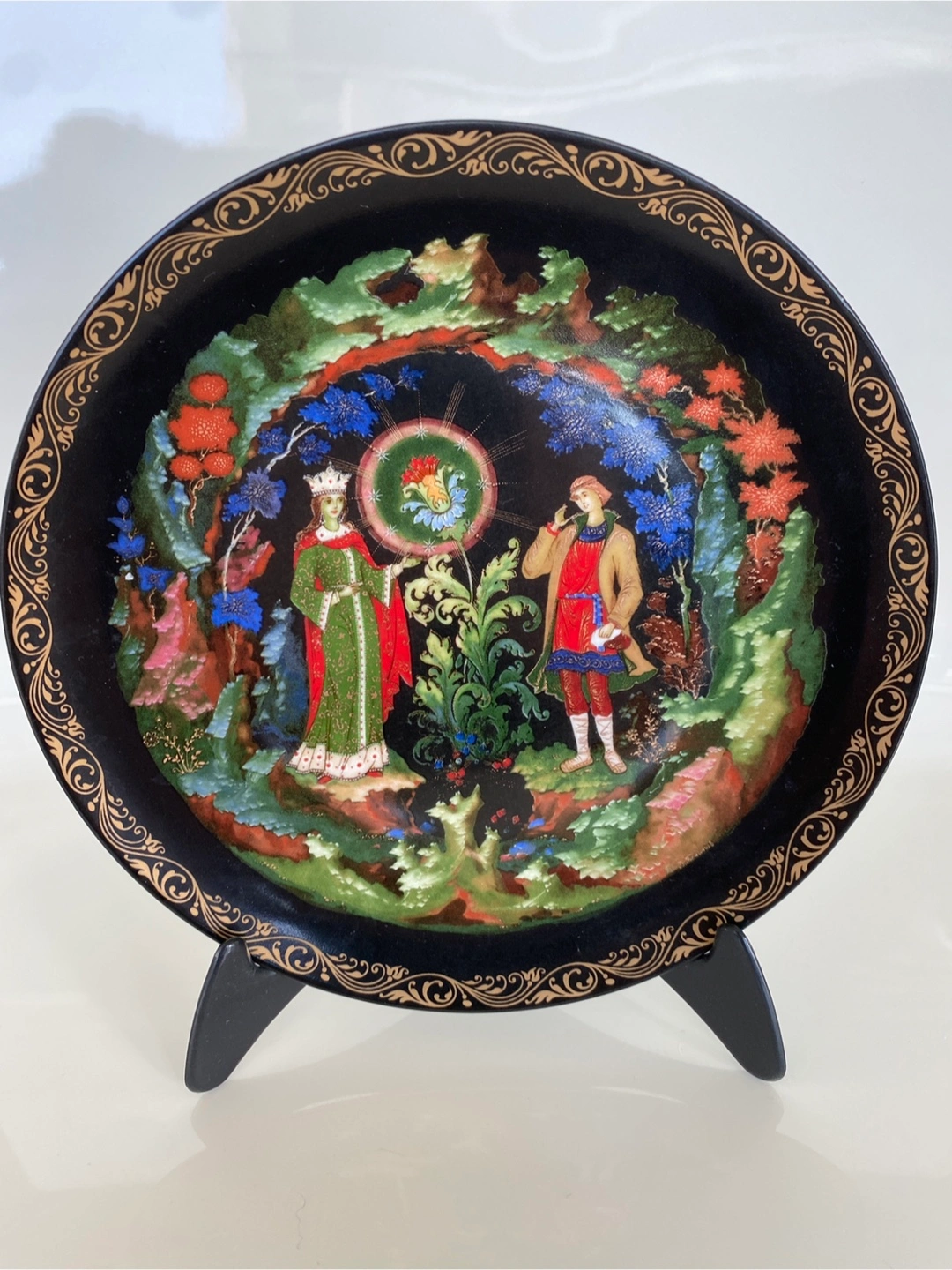 Beautiful hand-painted Russian lacquer plate featuring a traditional folk scene. The plate has a black background with intricate gold detailing around the rim. It's in great condition and would make a lovely addition to any collection or a unique piece of home decor.