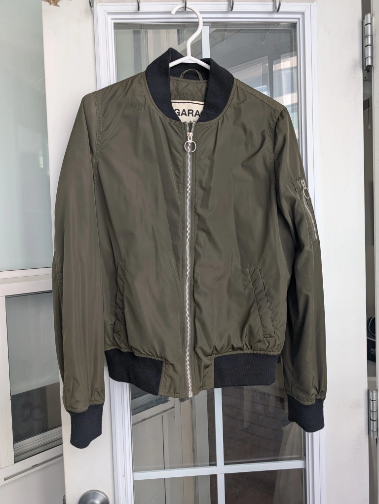 Here's a Garage bomber jacket in a stylish olive green colour! It's in great condition and ready for a new home. Perfect for adding a bit of edge to your outfit