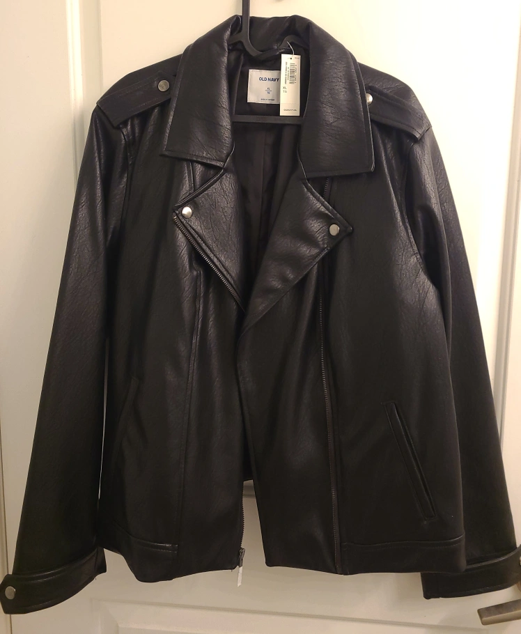 Selling a stylish black faux leather jacket in size XL. It's in great condition and would be a great addition to your wardrobe!