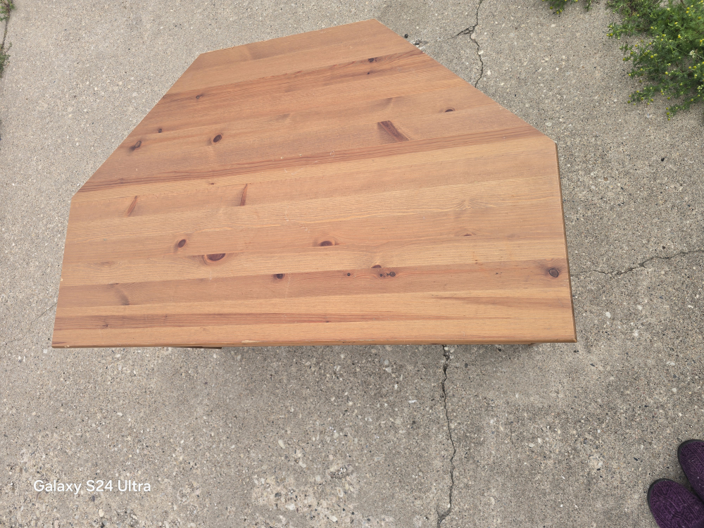 Selling a wooden corner shelf unit. It's in good condition and would be perfect for a TV stand or general storage! It has a nice natural wood finish