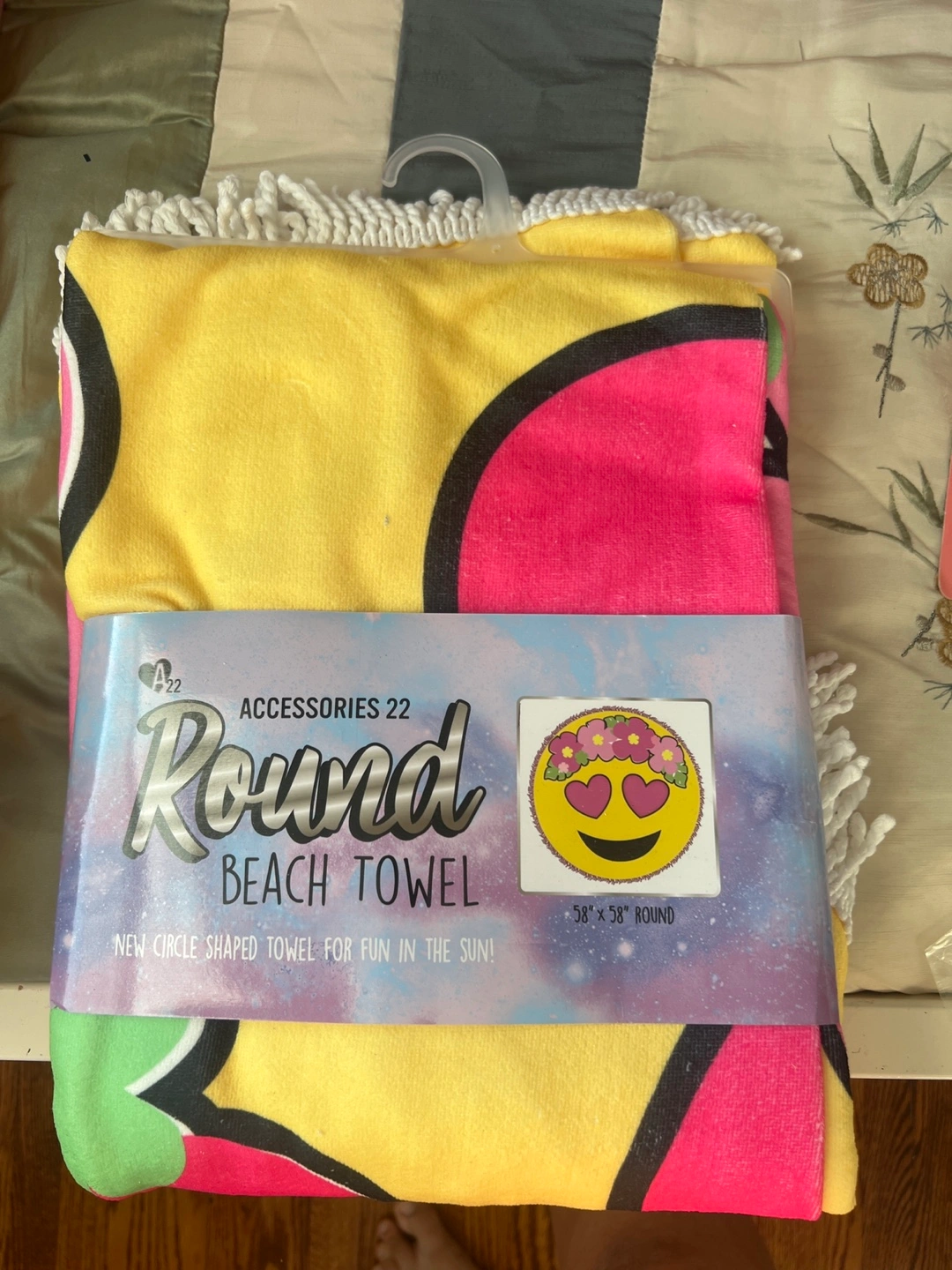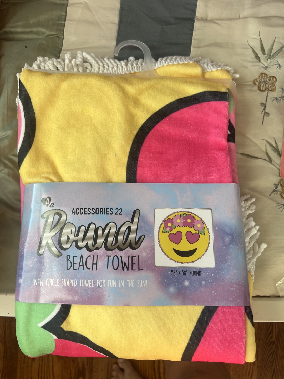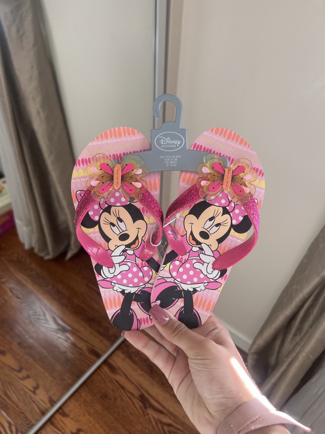 Minnie Mouse sandals and Round Smily face Beach Towel. Sandals are a size US 11/12 and feature a cute Minnie Mouse design with flower accents. They are brand new, never worn. Comes with a towel that is circle shaped and is a smily face. also brand new. it’s 58” x 58”