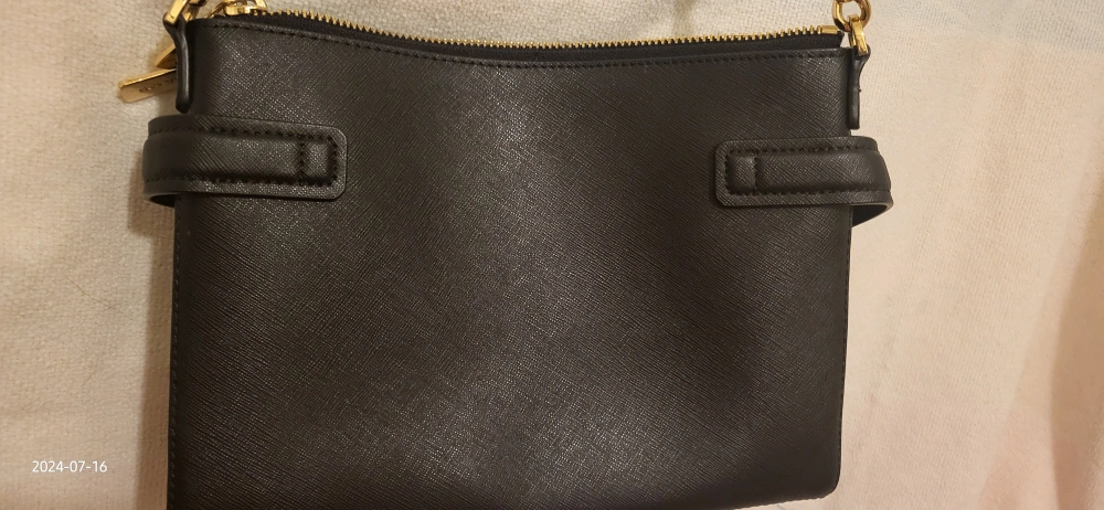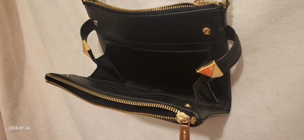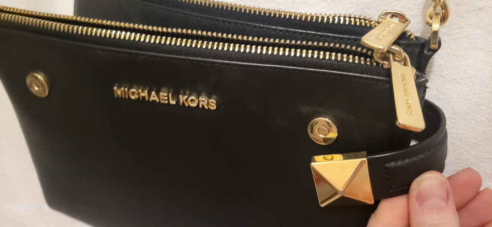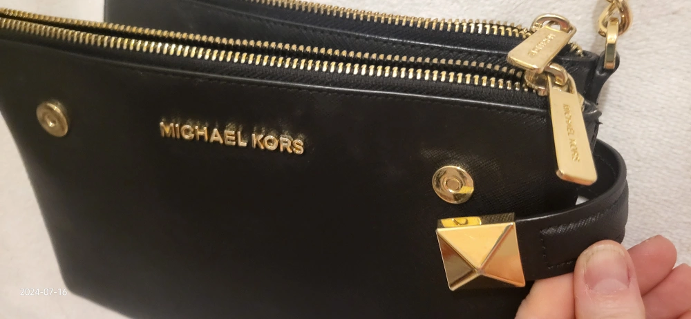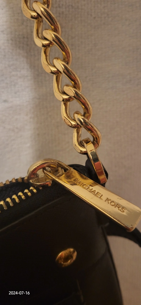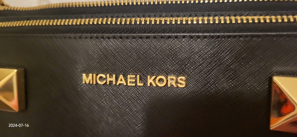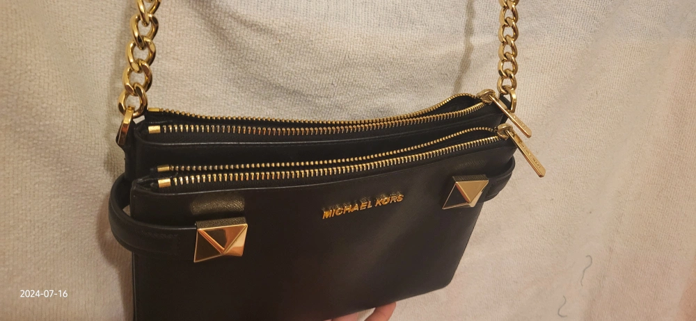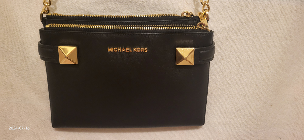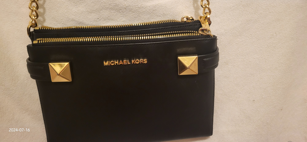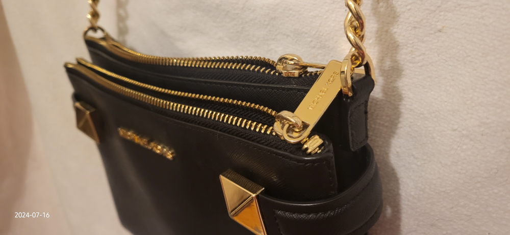 This is a stylish Michael Kors crossbody bag in black. It has a studded design and gold-tone hardware, including zippers and a chain strap. It's perfect for carrying your essentials!