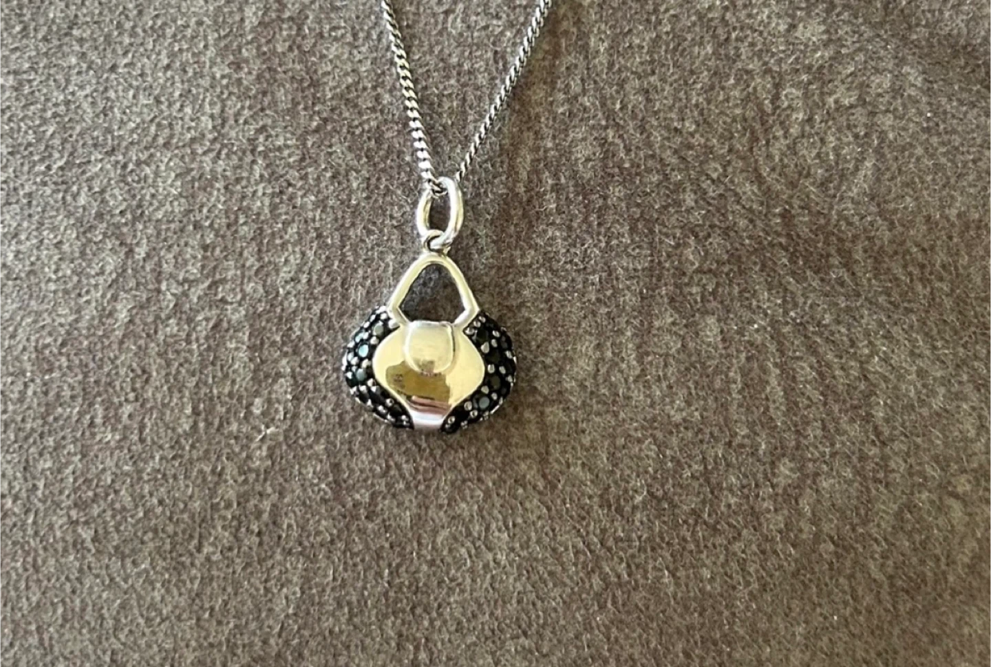 This is a very cute 925 silver black handbag pendant. The pendant is adorned with black Swarovski crystals, and It's in new condition.