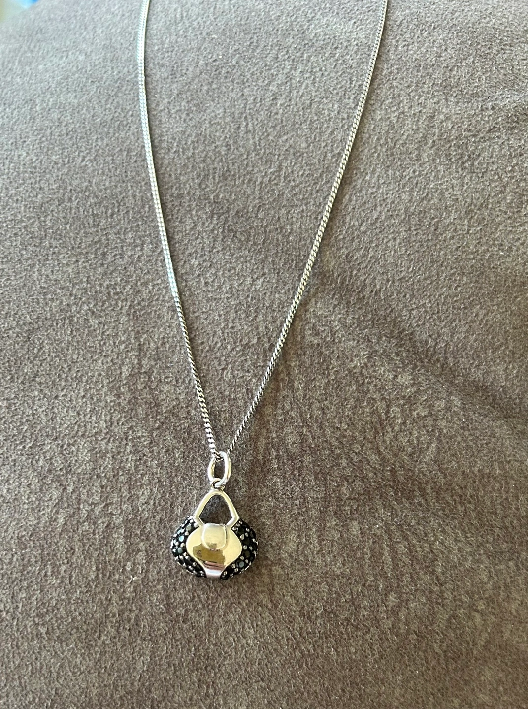 1000+This is a beautiful necklace with a 925 silver chain and a 925 silver handbag pendant. The pendant is adorned with black Swarovski crystals, adding a touch of elegance to any outfit. It's in new condition Cute looking purse! ๐
