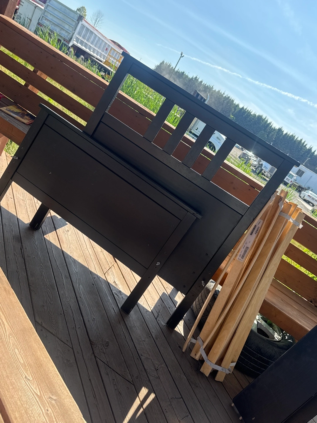 Selling an IKEA Hemnes bed frame in black-brown. It's in great shape and ready for a new home. All the necessary parts are included!