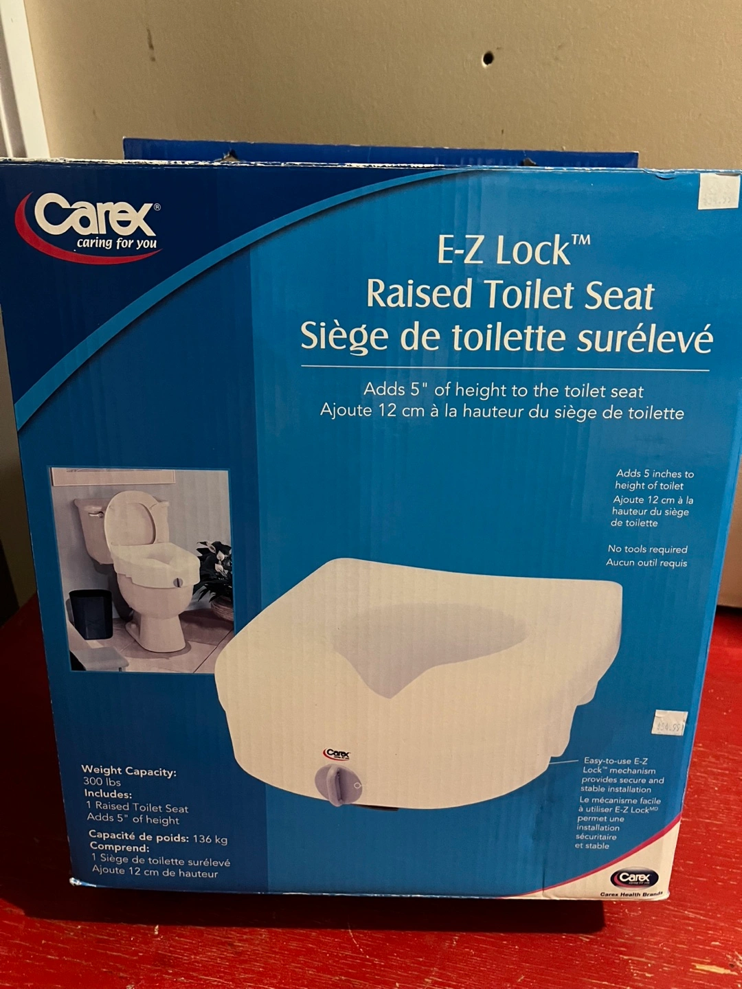 Selling a Carex E-Z Lock Raised Toilet Seat! It adds 5" of height to the toilet seat and has a weight capacity of 300 lbs (136 kg). It's easy to use with the E-Z Lock mechanism for secure and stable installation. No tools are required for installation, making it super convenient