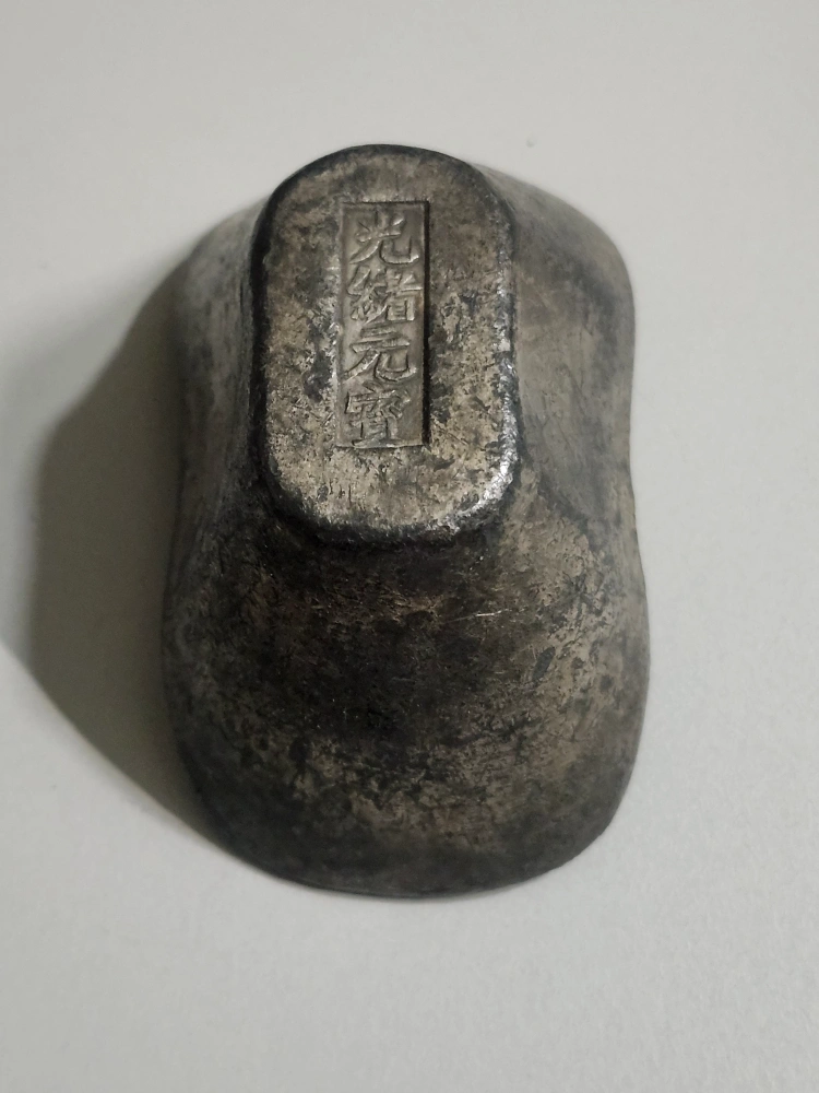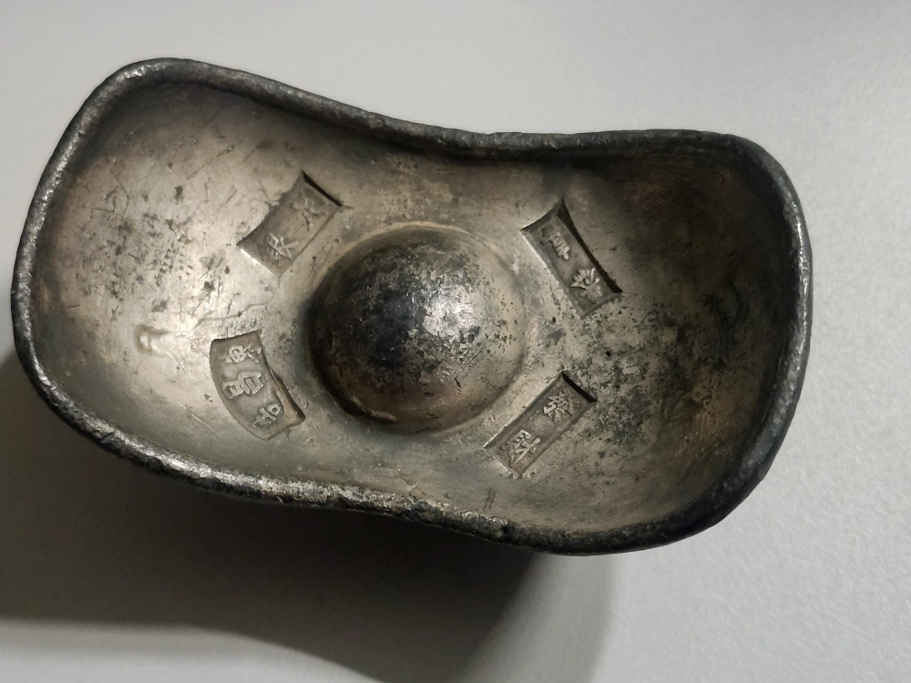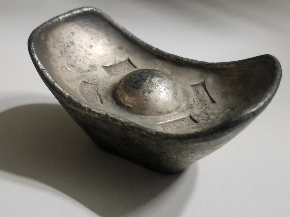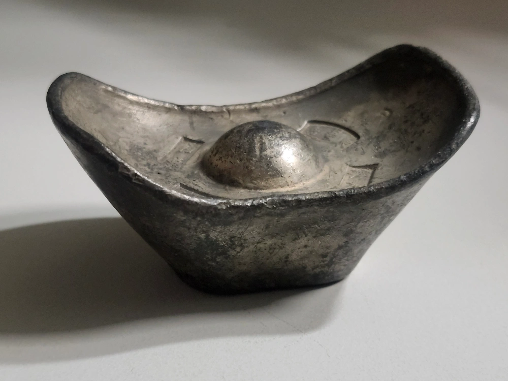 Here's a vintage silver ingot, perfect for collectors or as a unique decorative piece. It has some visible wear, adding to its antique charm. Feel free to message with any questions!